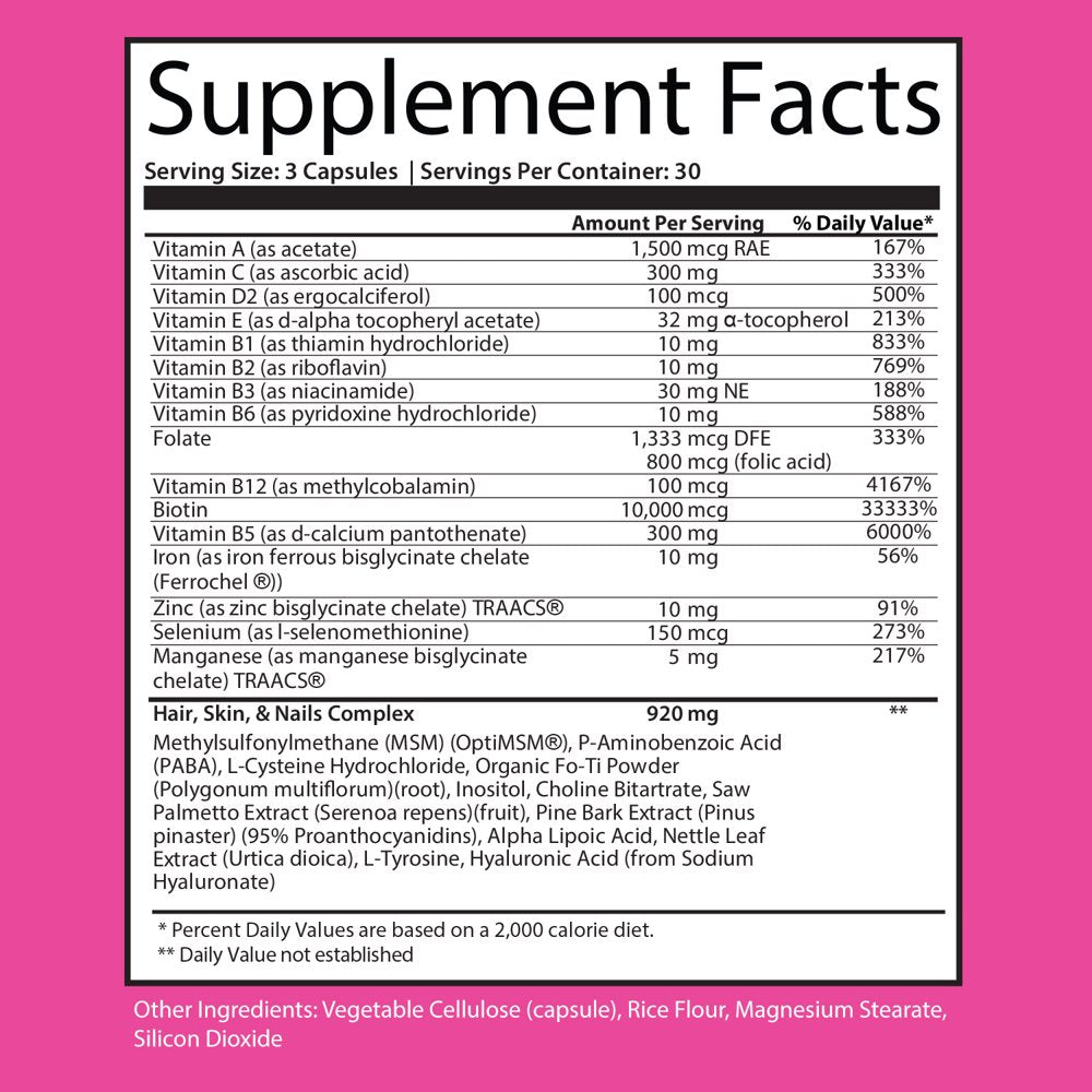 Vitamin A, Vitamin C, Vitamin D, Vitamin E, Vitamin B1, Vitamin B2, Vitamin B3, Vitamin B6, Folic Acid, Vitamin B12, Biotin (10,000mcg), Vitamin B5, Iron, Zinc, Selenium, Manganese, Hair Skin and Nails Complex: MSM-OptiMSM, Aminobenzoic Acid (PABA), L-Cysteine Hydrochloride, Organic Fo-Ti Powder, Inositol, Choline Bitartrate, Saw Palmetto Extract, Pine Bark Extract, Alpha Lipoic Acid, Nettle Leaf Extract, L-Tyrosine, Hyaluronic Acid/div>