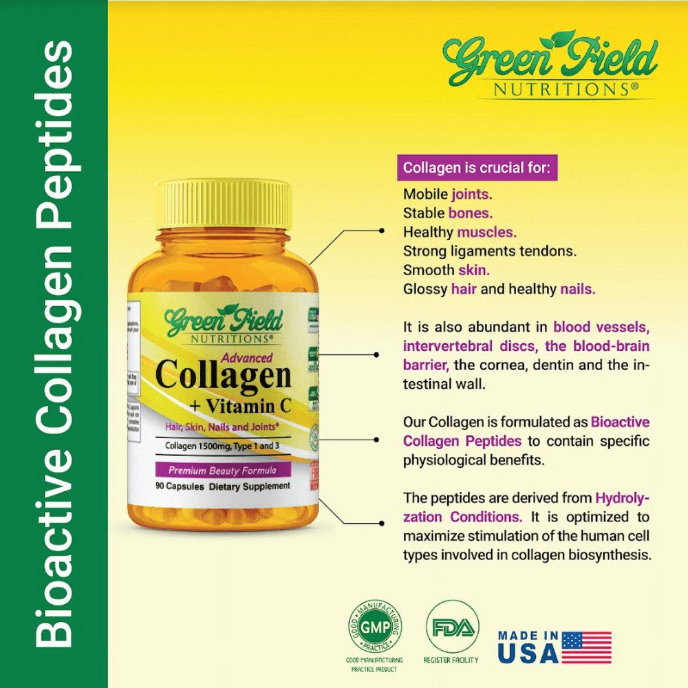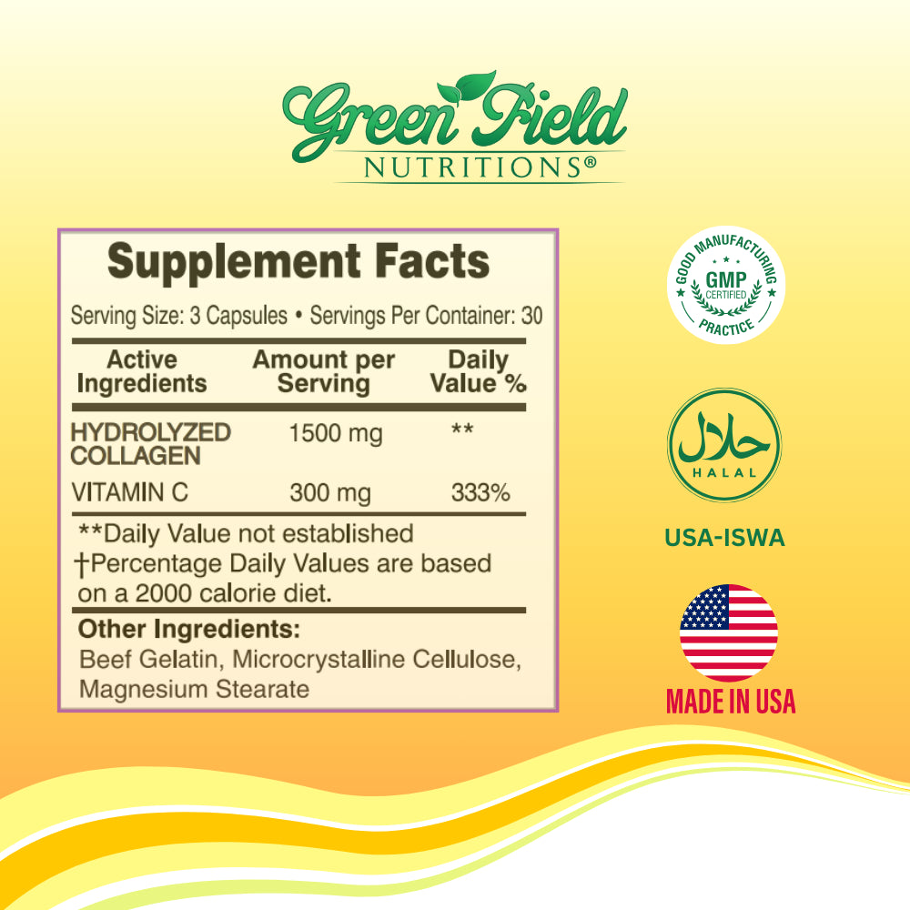 Greenfield Nutritions - Halal Collagen 1500 Mg with Halal Vitamin C, Hair, Skin, Nails, & Joints 90 Capsules