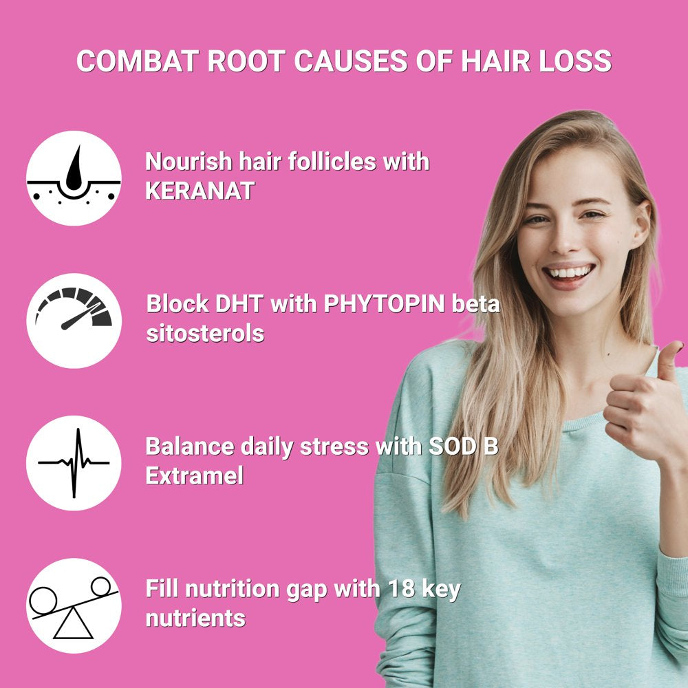 UpNourish LUSTROUS HAIR is a unique hair loss solution specifically formulated for women with clinically proven ingredients Keranat, SOD B, Phytopin, BeYoungCTP and additional 18 nutrients.