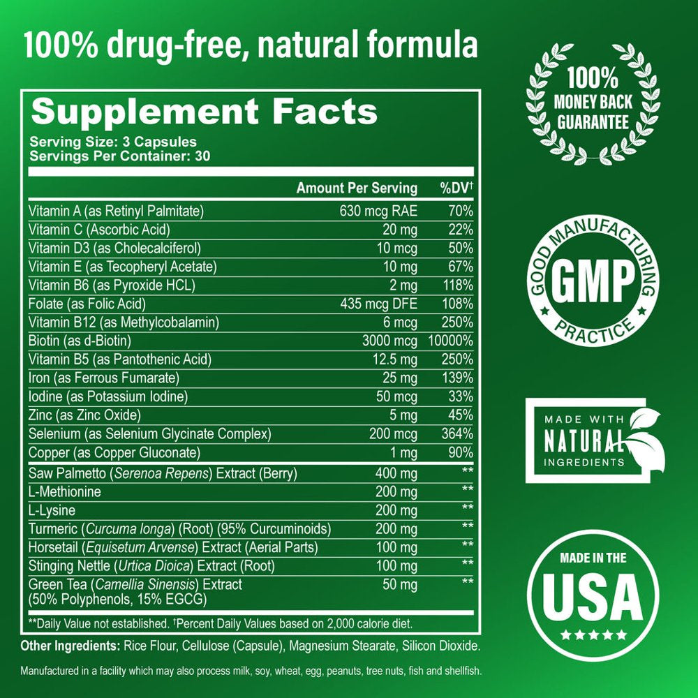 • SCIENCE DRIVEN FORMULATION: Saw palmetto, nettle, horsetail, turmeric, green tea, l-methionine, l-lysine & biotin. With vitamins, minerals & micronutrients to address nutritional deficiencies.