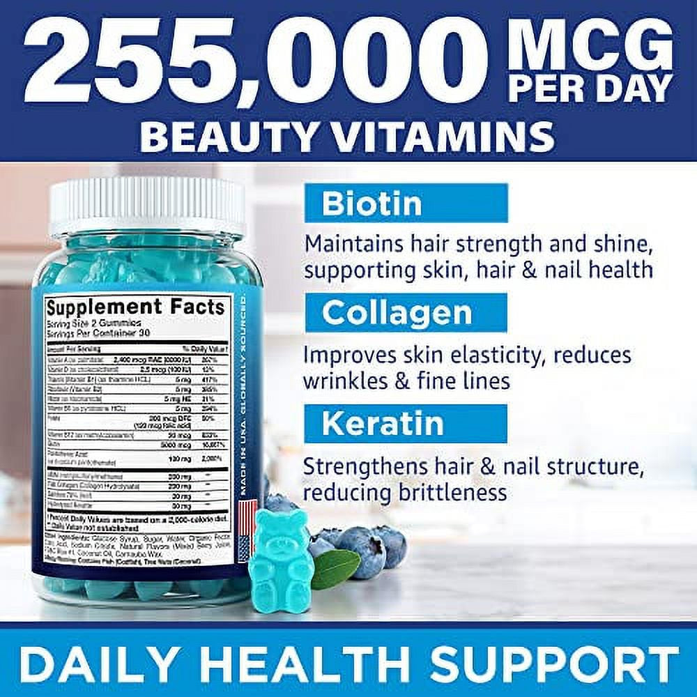 Hair Vitamins Natural Gummies - Biotin Multivitamin for Hair, Skin & Nails with Collagen & Keratin - anti Aging Collagen Gummy Vitamins for Men & Women - Hair & Nail Growth Gummies - 60Psc