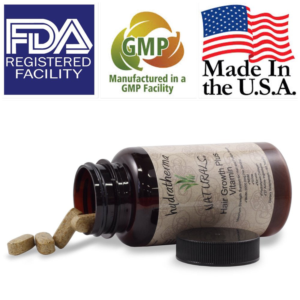 - SATISFACTION GUARANTEED- Made in the USA! We stand behind the Hair Growth Plus Vitamins by Hydratherma Naturals 100% . Our products are made with the highest quality ingredients in our FDA-registered manufacturing facility and follows GMP guidelines.