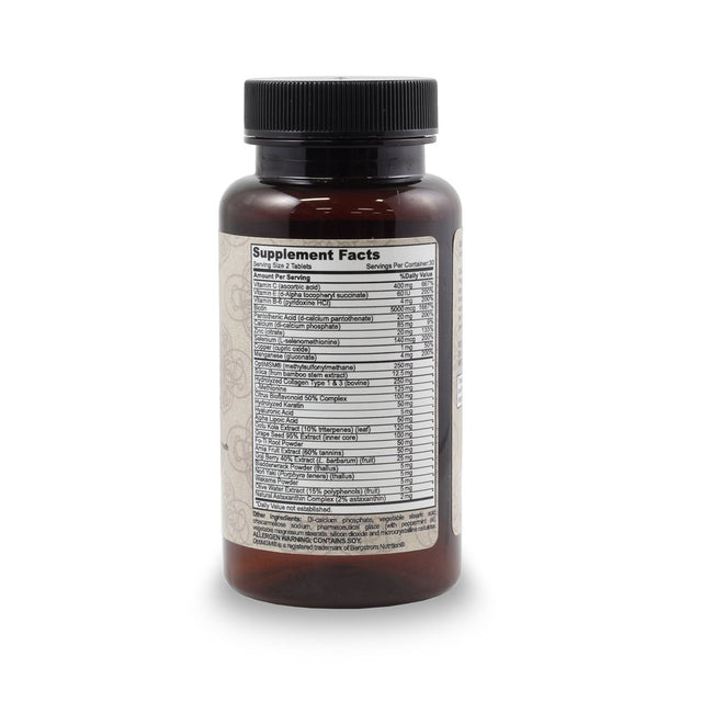 Product Description PROVIDES ALL OF THE NECESSARY VITAMINS, MINERALS, HERBS AND EXTRACTS THAT YOUR BODY NEEDS FOR HAIR GROWTH - ESSENTIAL VITAMINS FOR HAIR SKIN & NAILS -Our hair growth vitamins not only support fast hair growth but this hair supplement also supports healthy skin and nails. Enriched with 27 natural maximum strength vitamins, minerals, herbs and extracts to promote hair regrowth including: VITAMIN C & GRAPE SEED EXTRACT Powerful antioxidants. BIOTIN 5000mcg of Biotin to support strong nails, healthy hair and beautiful skin. Supports hair growth and hair loss prevention. MSM Awesome hair supplement to reduce / reverse hair loss and thinning for faster hair growth. COLLAGEN A major structural protein of connective tissues (skin health). KERATIN A protein responsible for keeping the hair strong and pliable. HYALURONIC ACID Plays a critical role in skin health with its unique ability to hold in moisture resulting in youthful skin naturally. COPPER FOR ANTI- GREY SUPPORT & many more vitamins, minerals and extracts for hair growth.