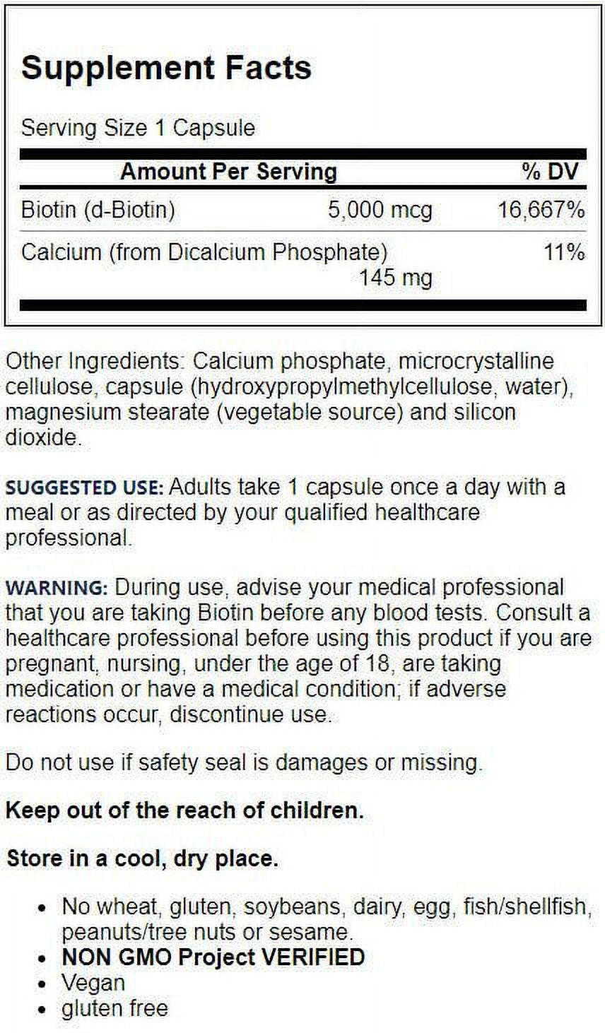 Jarrow Formulas Biotin 5000Mcg, Energy Production, Skin and Hair Support, 100 Caps