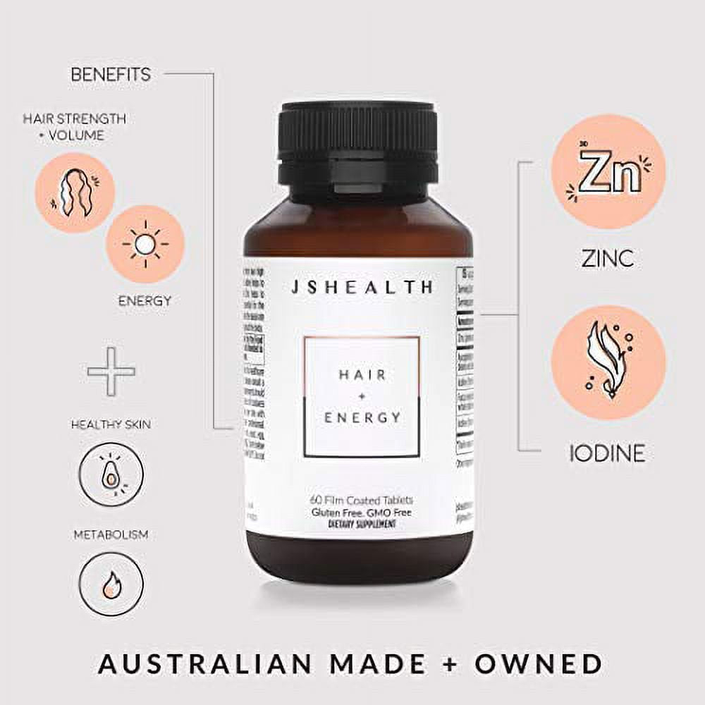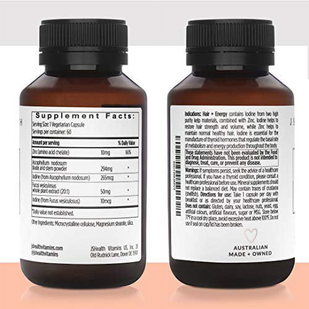 JS Health Hair + Energy FormulaJSHealth Vitamins was founded by Jessica Sepel, a clinical nutritionist, best-selling author and one of Australia's most sought-after health and wellness experts. Two years ago, the JSHealth team embarked on a journey to create a unique formula to support energy, metabolism and hair growth. Say goodbye to fad trends and gimmicks; this formula is backed by years of clinical research and is proven to work.Formulated with two carefully sourced essential minerals - iodine and zinc - which have been proven to assist with energy production, hair growth and hair strength. These two minerals may be hard to obtain from diet alone.Kelp is a sea vegetable that absorbs minerals from ocean water and is an amazing natural source of iodine. Iodine is essential for the manufacture of the thyroid hormones T3 and T4 that regulate basal metabolism in the body which supports energy production. The kelp found in our formula contains fucus vesiculosus and ascophyllum nodosum macroalgae seaweeds that are sourced from the pristine waters of Nova Scotia and Brittany. The seaweed is hand harvested in line with its seasonal growth cycle to ensure environmental sustainability and minimise disruption to the marine ecosystem. The kelp extracts placed in our formula are Tasmanian extracts. Research shows that in addition to the specific benefits of fucoidan and marine polyphenols on hair growth and maintenance, these compounds also have a diverse range of benefits in general health, antioxidants, UV protection and anti-inflammation, which are known to promote healthy hair and nails. Our formula is designed to be a very convenient part of your everyday health routine. One daily dose is all you need.