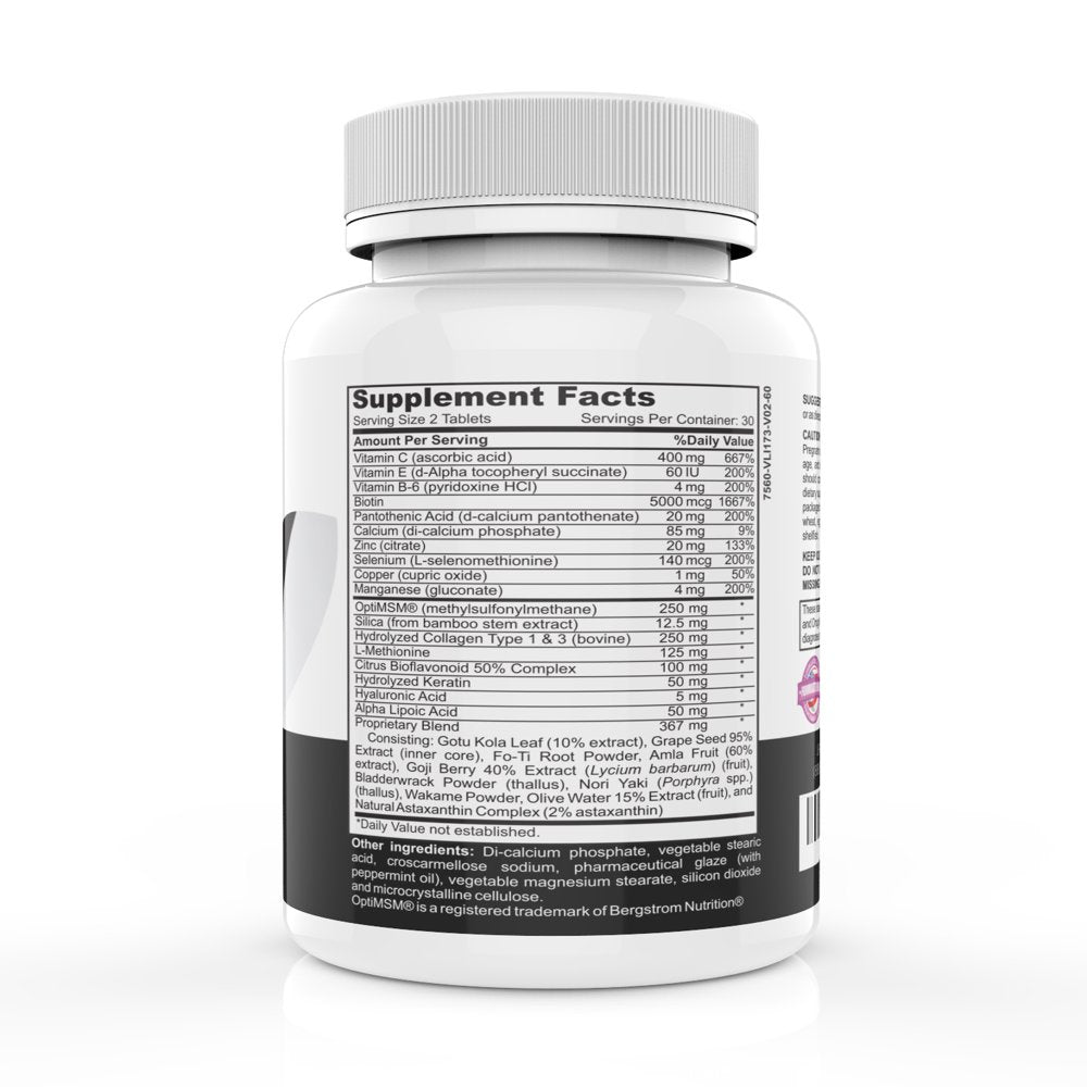 Vitamin C (ascorbic acid), Vitamin E (d-Alpha tocopheryl succinate), Vitamin B-6 (pyridoxine hcl), Biotin, Pantothenic Acid (d-calcium pantothenate), Calcium (di-calcium phosphate), Zinc (citrate), Selenium (L-selenomethionine), Copper (cupric oxide), Manganese (gluconate), MSM (Methyl Sulfonyl Methane), Silica (bamboo stem extract), Hydrolyzed Collagen Type 1 & 3 (bovine), L-Mehtionine , Citrus Bioflavonoid 50% Complex, Hydrolyzed Keratin, Hyaluronic Acid, Alpha Lipoic Acid, Gotu Kola Extract (10% triterpenes) (leaf), Grape Seed 95% Extract (inner core), Fo-Ti Root Powder, Indian Gooseberry Fruit Extract (60% tannins), Goji Berry 40% Extract (L. barbarum) (fruit), Bladderwrack Powder (thallus), Nori Yaki (Porphyra tenera) (thallus), Wakame Powder (Undaria pinnatifida), Olive Water Extract (15% polyphenols) (fruit), Natural Astaxanthin Complex (2% astaxanthin)/div>
