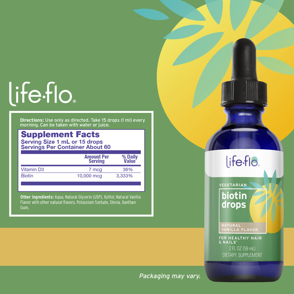 Life-Flo Biotin Drops 10,000 Mcg with Vitamin D3 | Liquid Supplement for Healthy Hair, Skin & Nails | 2Oz, 60 Servings