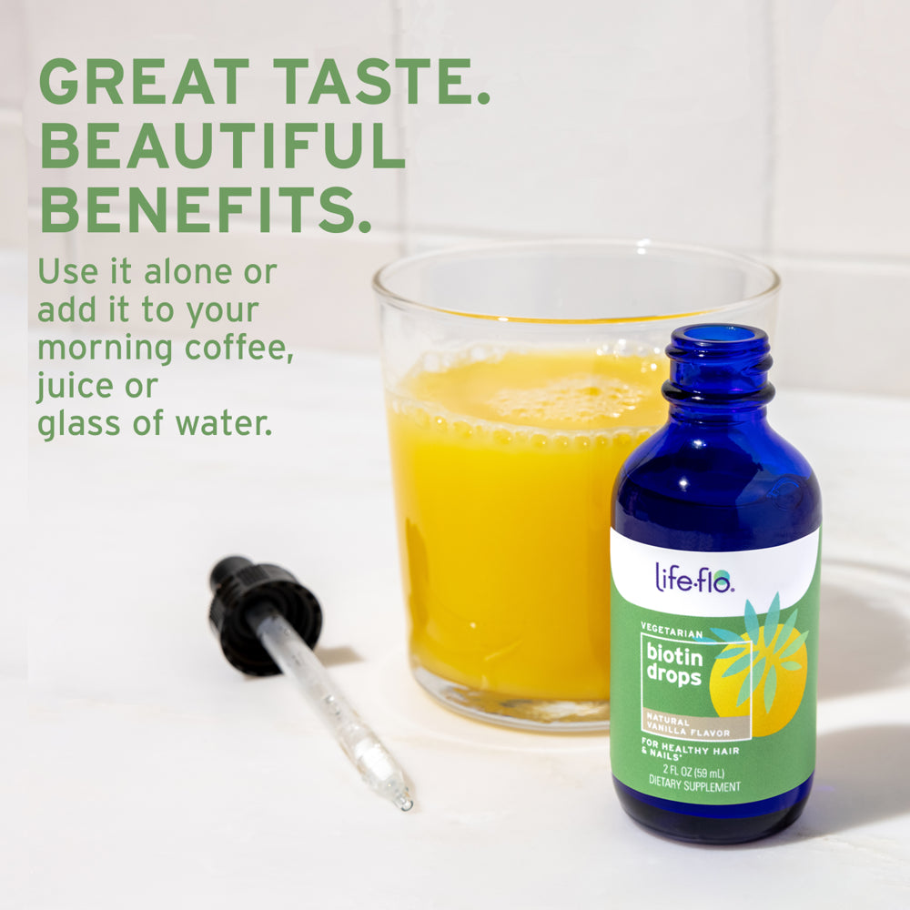Often known as “the beauty vitamin” for its beneficial effect on the hair, skin and nails, Biotin can make all the difference in the way you look and feel. Life-flo Biotin 10000 mcg Drops provide 10,000 mcg of this essential B vitamin per serving. Taken regularly, our liquid Biotin may help support vibrant hair and skin and healthy nails. This potent, vegetarian formula also includes 7 mcg (280 IU) of Vitamin D3, the “sunshine vitamin,” designed to help support healthy collagen production, strong bones and more. A step up from other Biotin alternatives, our liquid Biotin is designed for fast absorption and utilization by the body. These easy-to-take drops may be enjoyed in your morning coffee, juice or smoothie, or simply added to a glass of water. Plus you’ll love the great, natural vanilla flavor! Like all Life-flo products, our Biotin Drops are formulated with clean ingredients that are lab verified for purity and potency. Unlike many other companies, we manufacture almost all our own products in our state-of-the-art, GMP-certified facility in Utah. This gives us the ability to thoroughly test and screen raw ingredients for contaminants and impurities and manage the production process to bring you the best possible quality. Plus you can rest assured: our products are never tested on animals. Enjoy the Life-flo difference – try our Biotin Drops for beautiful hair, skin and nails!
