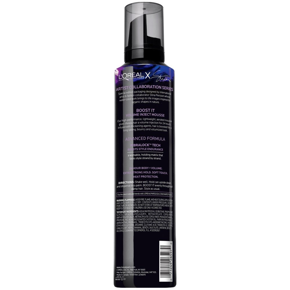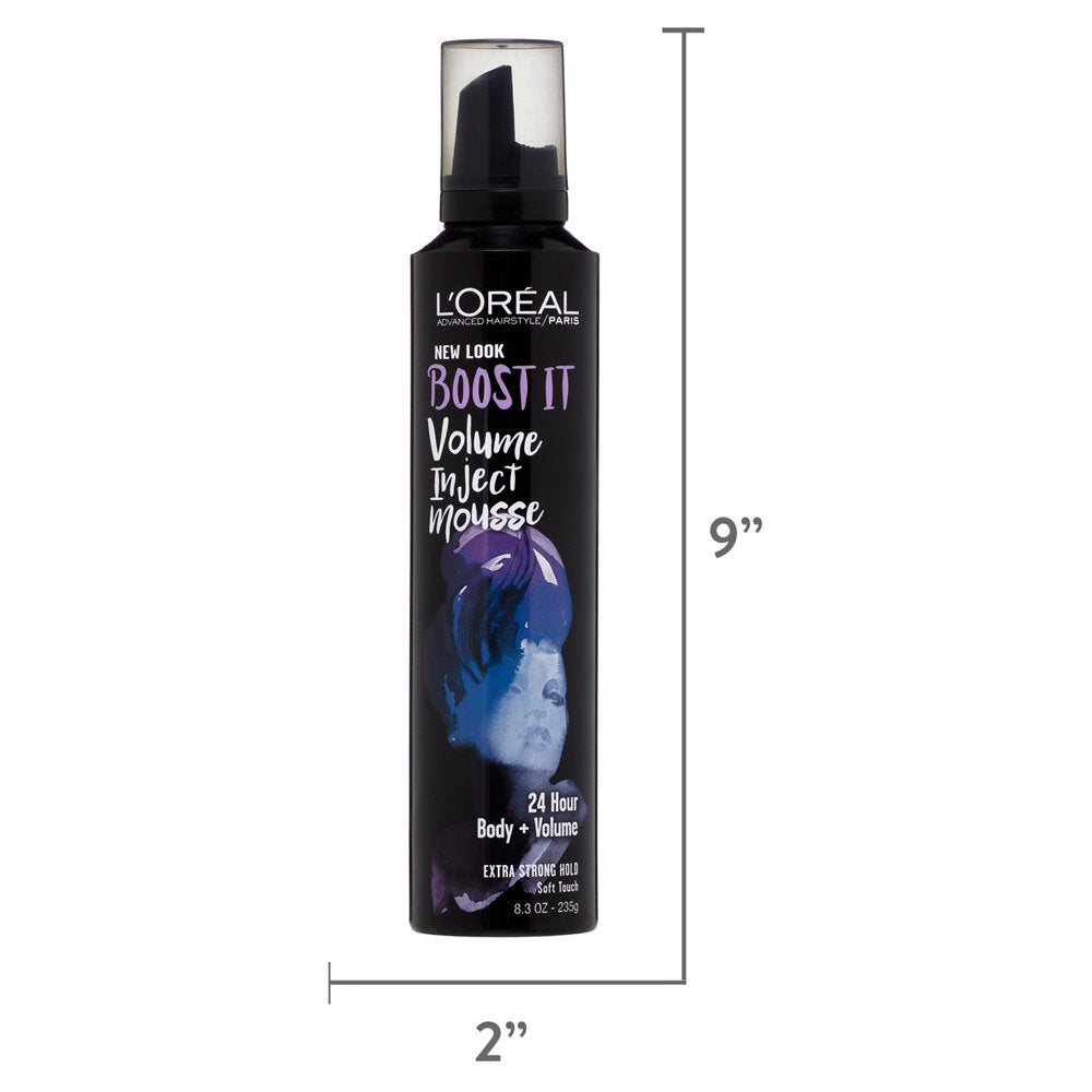 L'Oreal Paris Advanced Hairstyle Boost It 24 Hour Body + Volume Hair Styling Mousse, L'Oreal Paris AHS BOOST IT Volume Inject Mousse is a high-performance, lightweight, aerated foam that gives lifeless, fine hair a volume injection for 24 hours. Infused with thickening agents, hair is boosted for a long lasting, bouncy and voluminous look. Perfect for adding volume to long hairstyles, short hairstyles or medium hairstyles.