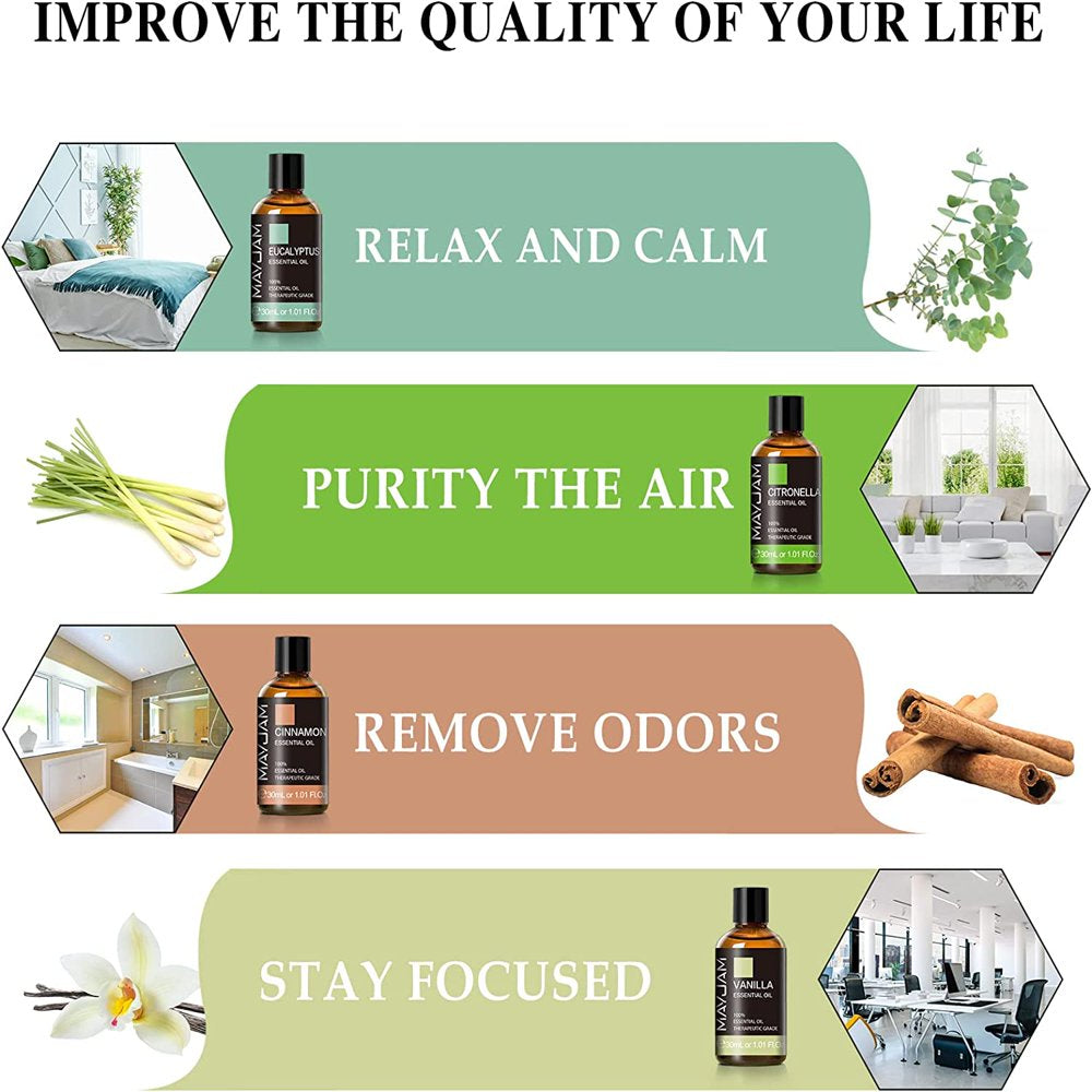 • Wonderful Scent: MAYJAM essential oils are highly concentrated liquid derived from plants' flowers, leaves or other parts, which will provide you with a pure and pleasant aroma. The scents of essential oils are extremely rich, complex and long lasting.