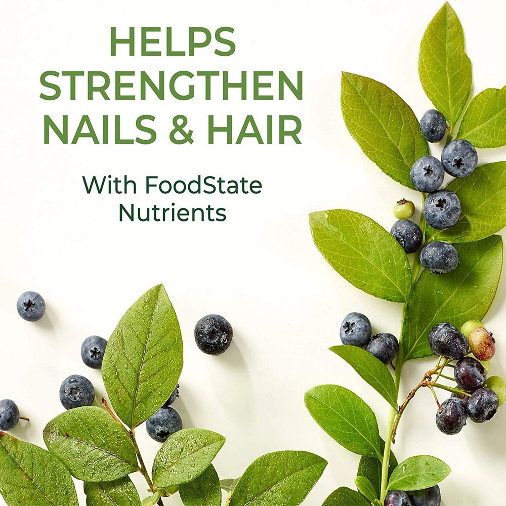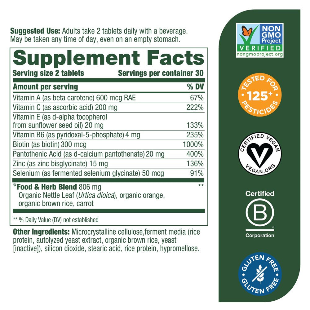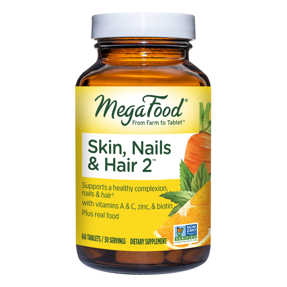 From Farm to Tablet° Supports a Healthy Complexion, Nails & Hair With Vitamins A & C, Zinc, & Biotin Plus Real Food Dietary Supplement Non GMO Project Verified Tested for 125+ Pesticides Made Without 9 Food Allergens Glyphosate Residue Free Gluten Free Certified Vegan Certified B Corporation Kosher MegaFood Skin, Hair & Nails 2 supports a healthy complexion, nails & hair with vitamins A & C, zinc, and biotin. It also includes a food & herb blend. We believe the most nutritious food comes from healthy soil. Our goal is to partner with farmers who share our commitment to regenerative agriculture, working to nourish the soil for quality ingredients that make for premium supplements.