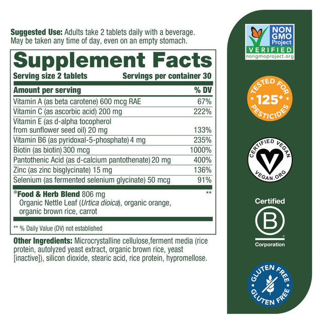 Vitamin A, Vitamin C, Vitamin E, Vitamin B6, Biotin, Pantothenic Acid, Zinc, Selenium, Organic Nettle Leaf, Cellulose, Silica, Stearic Acid/div>