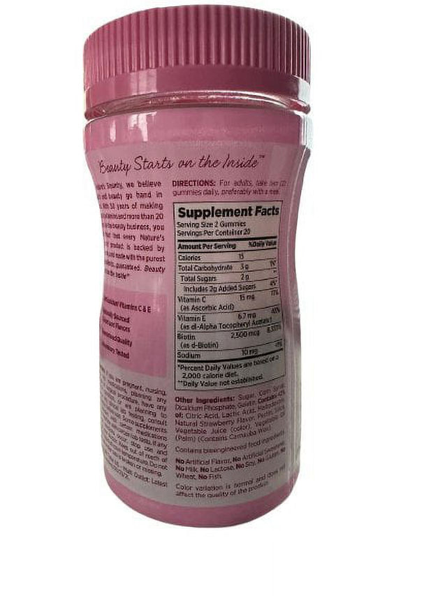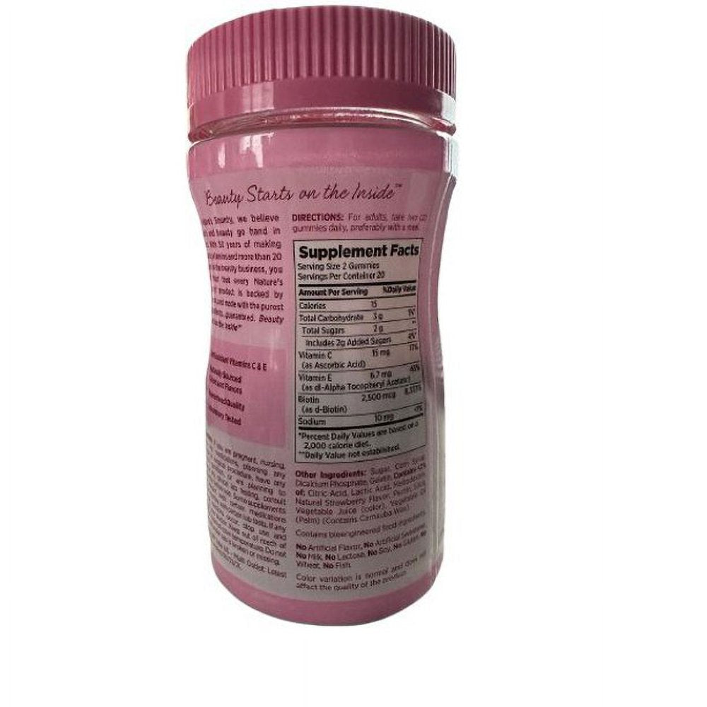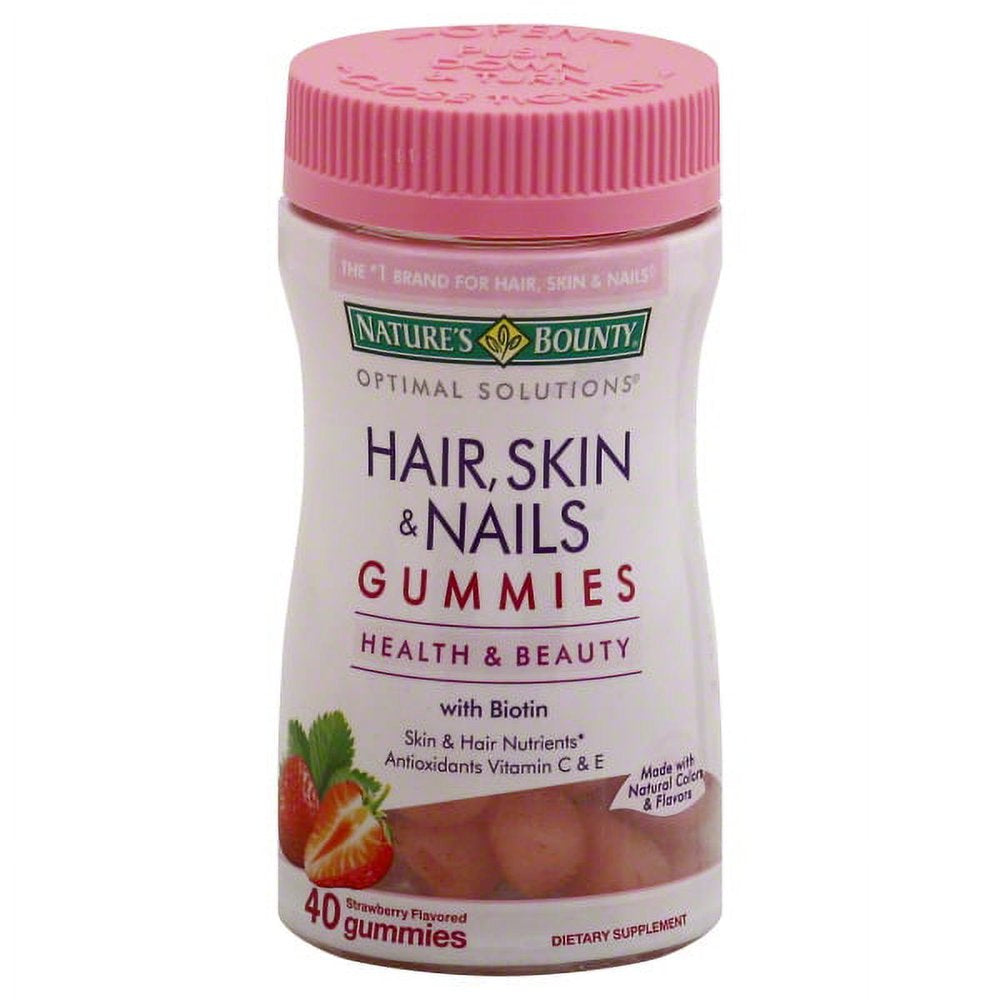 • Dietary Supplement. With biotin. Health & beauty. Skin & hair nutrients. Antioxidants vitamin C & E. Made with natural colors & flavors. The No. 1 brand for hair, skin & nails (Source: Nielsen xAOC 52 weeks ending 2/20/16). Looking good and feeling great has never been this delicious! Nature's Bounty Optimal Solutions Hair, Skin & Nails Gummies contain just the right balance of nutrients to support lustrous hair, healthy nails and vibrant skin, all in a delicious strawberry flavored gummy. Nature's Bounty Optimal Solutions Hair, Skin & Nails Gummies provides you with the vital nutrients your body needs to support your natural beauty from within. Vitamin E and vitamin C are antioxidants. Vitamin E contributes to skin health, and vitamin C is involved in collagen production and formation, which forms the basis for vibrant skin. Biotin helps to maintain healthy hair and nails. No artificial flavor, no milk, no lactose, no soy, no gluten, no wheat, no yeast, no fish. Sodium free. Natural color variation is normal and does not affect the quality of the product. Nutrition questions or comments? Call 1-800-433-2990 Mon. - Sat. 9 AM - 7 PM ET. For educational health tips and savings join our e-newsletter, visit www.NaturesBounty.com. (These statements have not been evaluated by the Food and Drug Administration. This product is not intended to diagnose, treat, cure or prevent any disease.) Made in the USA with select ingredients from around the world.