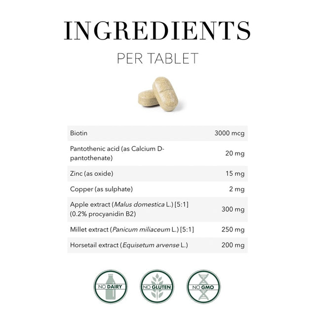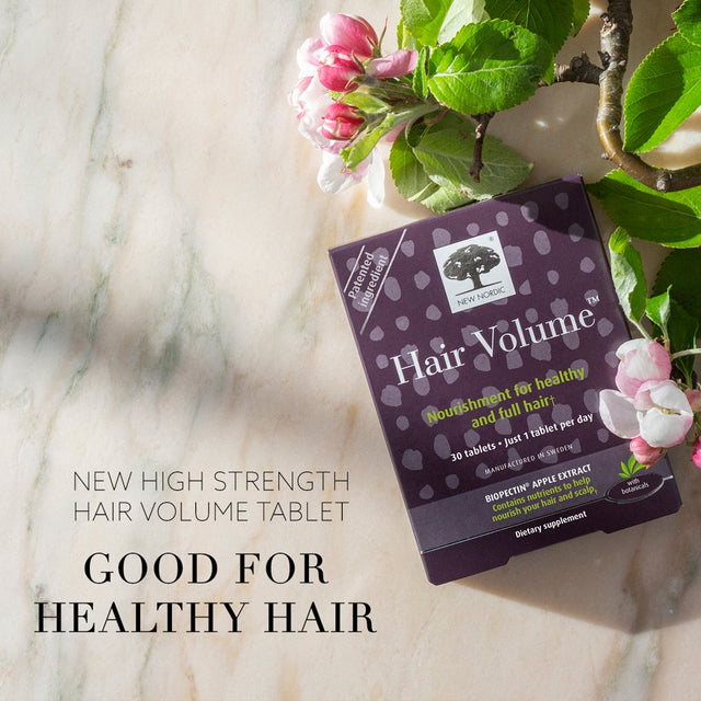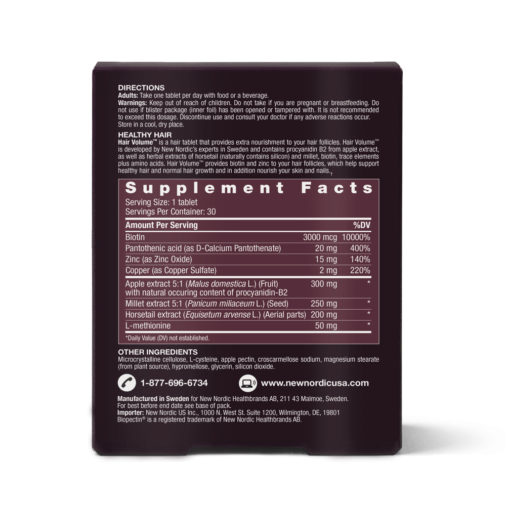 Patented Ingredient Helps Support Healthy Hair and Normal Hair Growth Just 1 Tablet Per Day Biopectin® Apple Extract Contains Nutrients to Help Nourish Your Hair and Scalp Dietary Supplement No Dairy No GMO No Gluten Healthy Hair Hair Volume™ is a hair tablet that provides extra nourishment to your hair follicles. Hair Volume™ is developed by New Nordic's experts in Sweden and contains procyanidin B2 from apple extract, as well as herbal extracts of horsetail and millet, biotin, trace elements plus amino acids. Hair Volume™ provides biotin and zinc to your hair follicles, which help support healthy hair and normal hair growth and in addition nourish your skin and nails. Apple The Biopectin® apple extract used in these tablets has a natural content of procyanidin B2. The apples are picked, mashed, dried and extracted, so that the desired herbal substances are preserved. This guarantees the high quality.