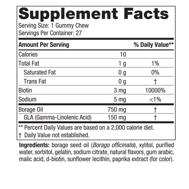 Other ingredients: borage seed oil, xylitol, purified water, sorbitol, gelatin, sodium citrate, natural flavors, gum arabic, malic acid, d-biotin, sunflower lecithin, paprika extract. No gluten, milk derivatives, or artificial colors or flavors./div>