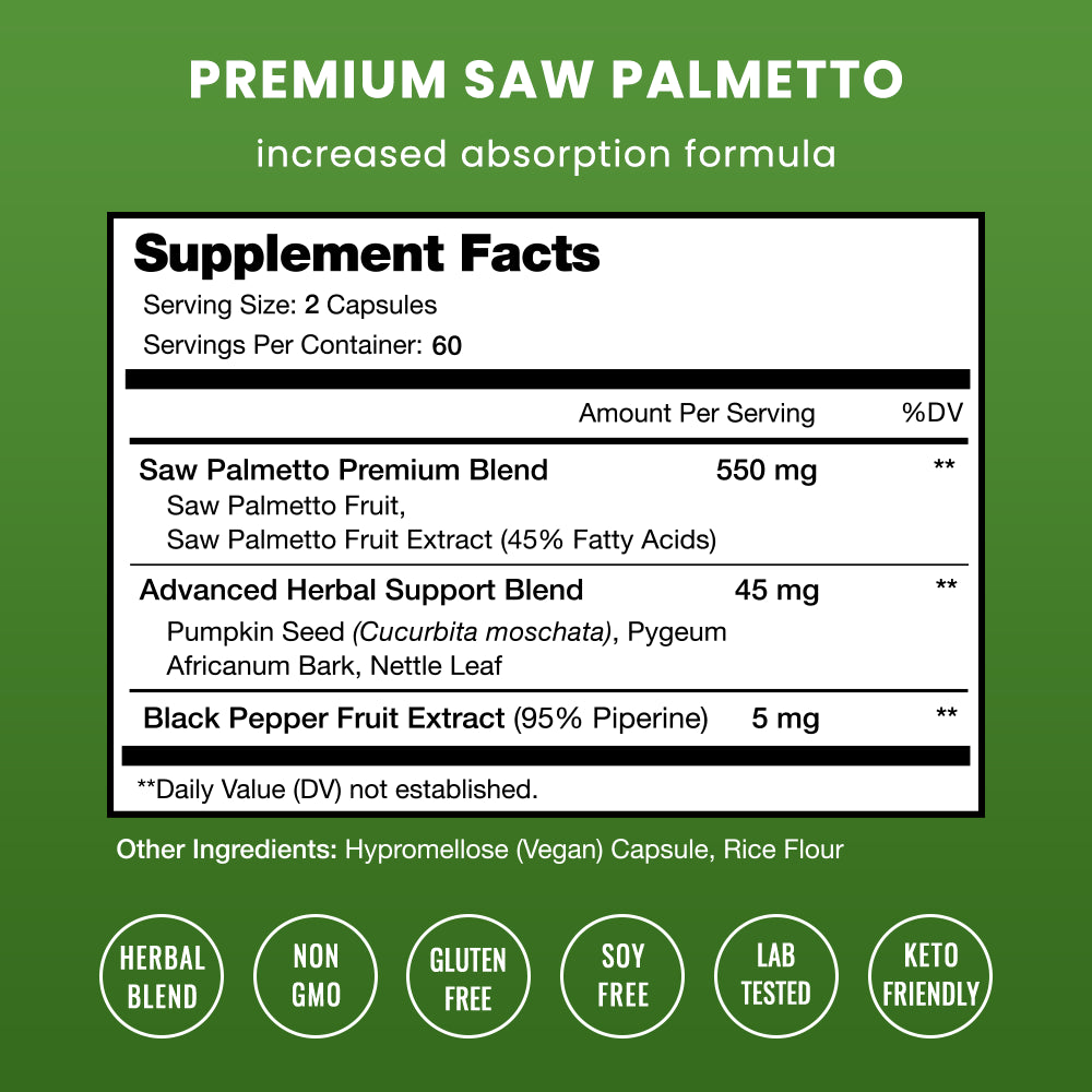 - Enhanced Absorption with Black Pepper - NutraChamps’ premium Saw Palmetto formula includes black pepper extract for increased bioavailability and benefits. The black pepper extract featured in this blend is scientifically proven to improve your body’s ability to absorb nutrients, allowing for even better results than a basic herbal or prostate health supplement.