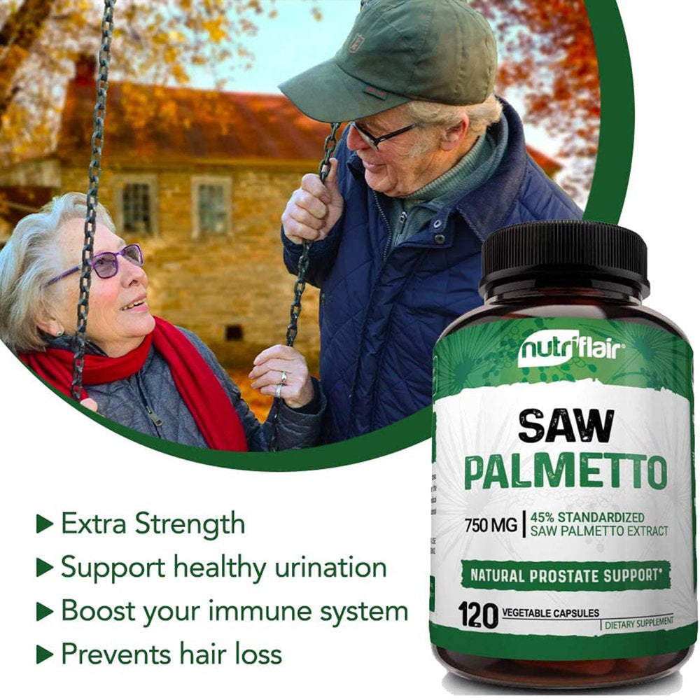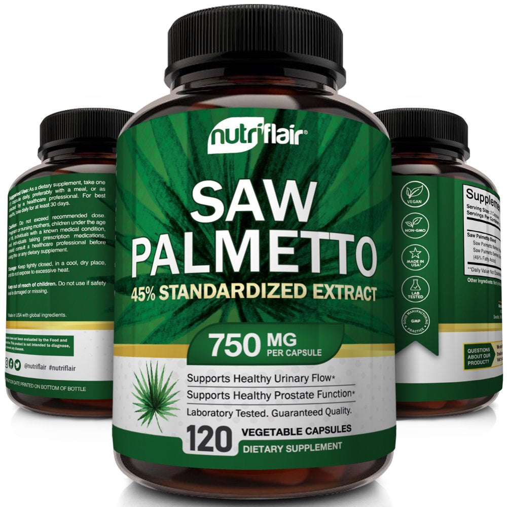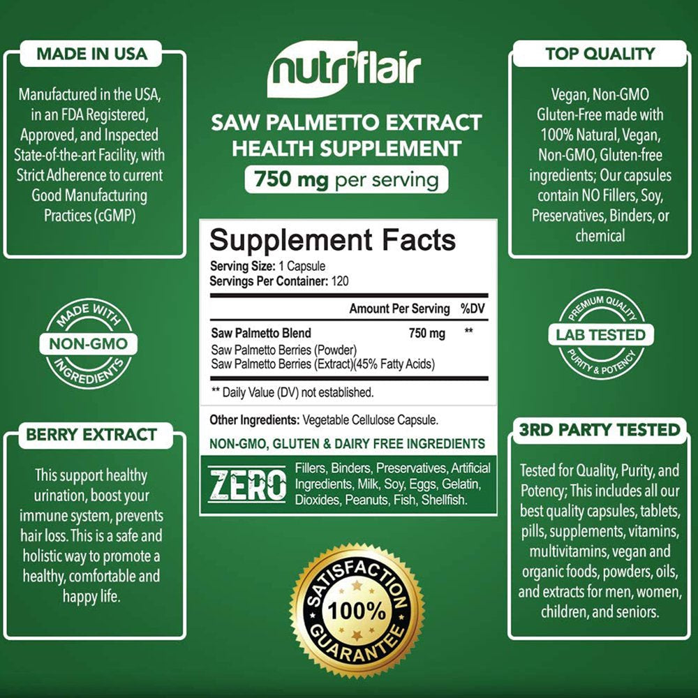 | Product Name | NutriFlair Saw Palmetto Extract 750mg, 120 Capsules - Natural Prostate Supplement & Berry Health Support - Helps Block DHT to Prevent Hair Loss and Helps Reduce Frequent Urination, for Women and Men |