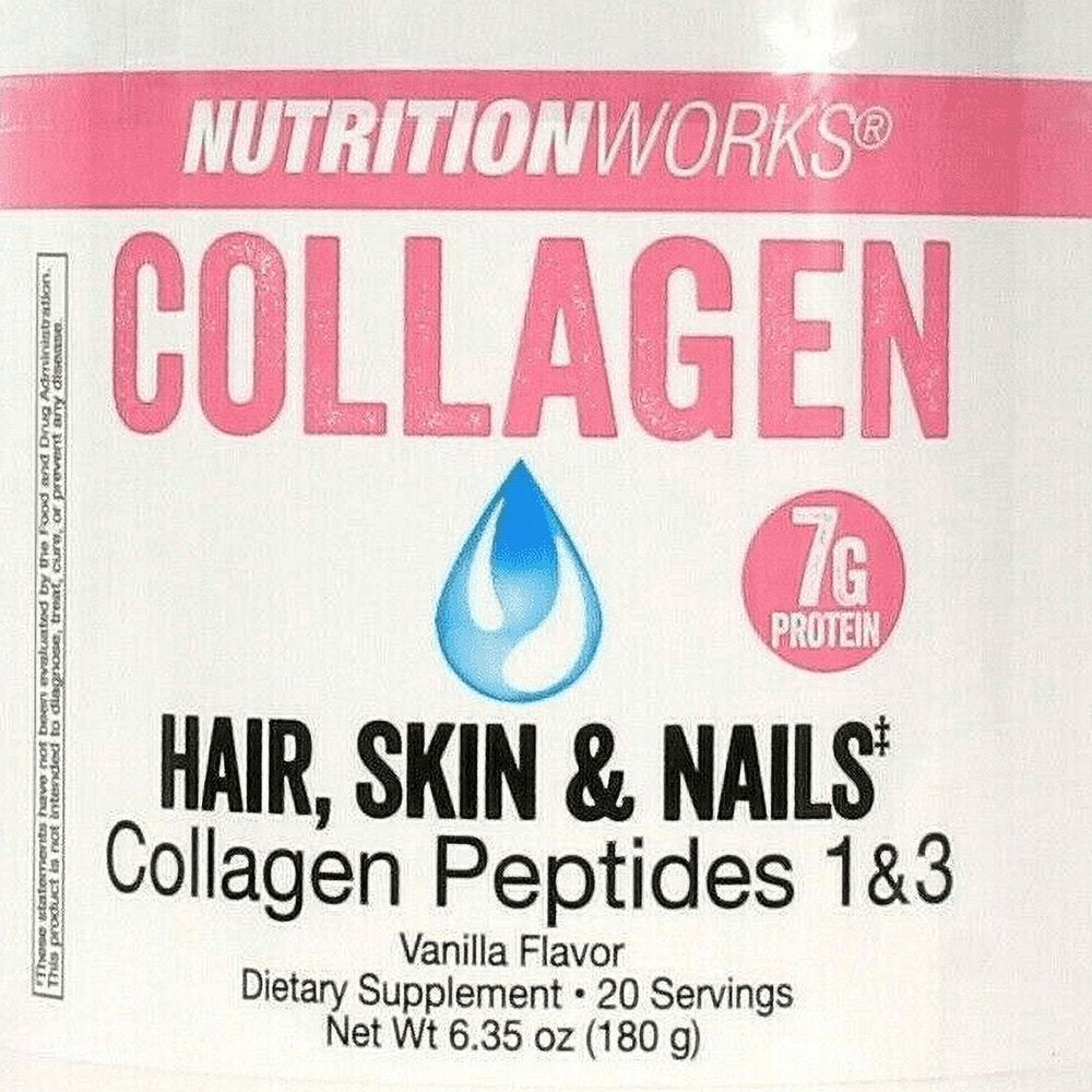 Nutrition Works 6.35 Oz Collagen 1 & 3 Hair Skin Nails Vanilla Flavor Supplement UPC: 035046127091 Formulation: Powder Active Ingredients: Collagen Expiration Date: 9/23 Ingredients: Collagen Main Purpose: Hair, Skin & Nail Health