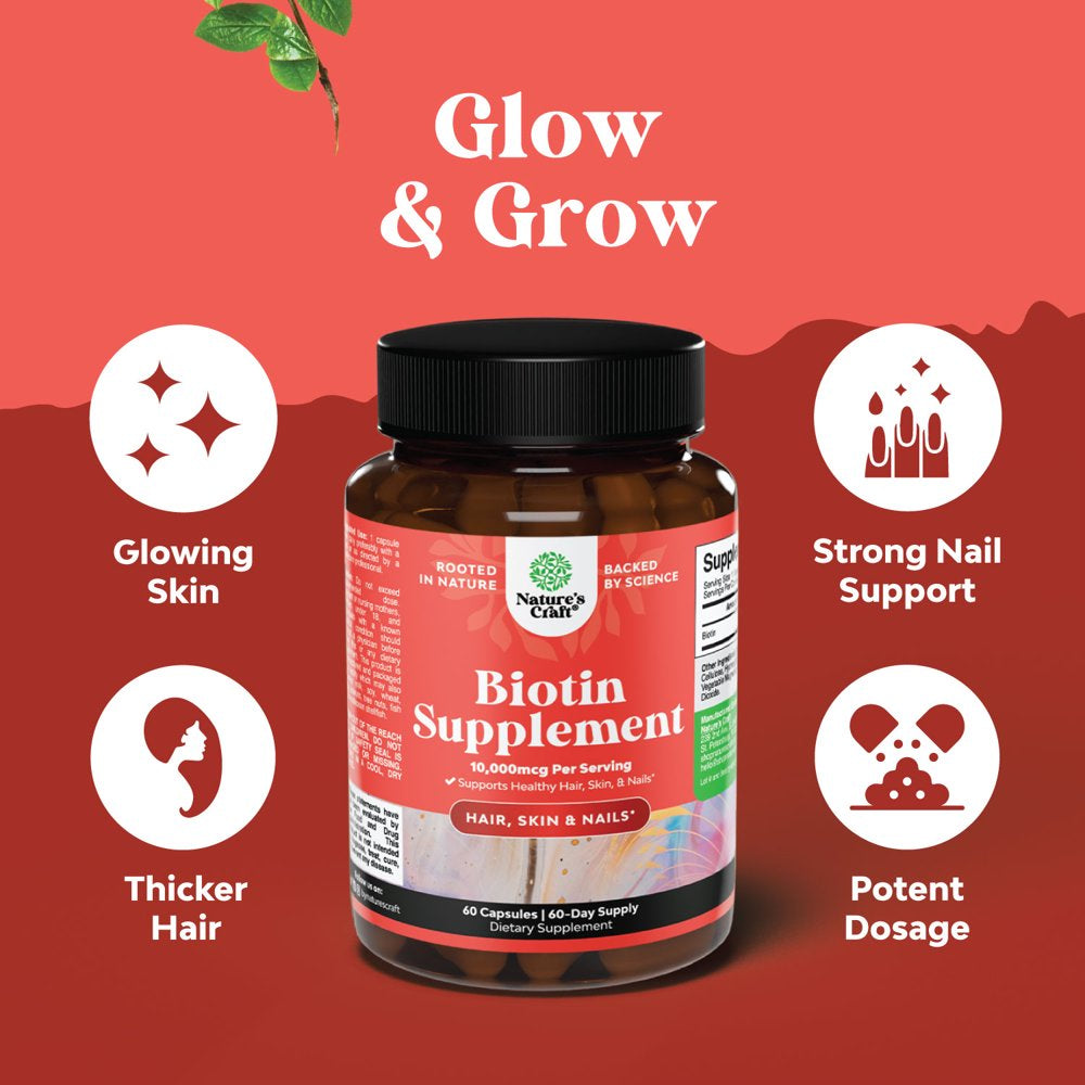 Enhanced beauty of your skin, hair, and nails. Enjoy all the amazing benefits of biotin, which promotes healthy hair growth, nourishes your skin, and strengthens weak nails. High potency biotin. We've packed ultra-strength dosage of pure and potent biotin in easy to take vegetarian capsules. The science behind biotin. Biotin, also called vitamin B7, is involved in a wide range of metabolic processes, primarily related to the utilization of fats, carbohydrates, and amino acids.