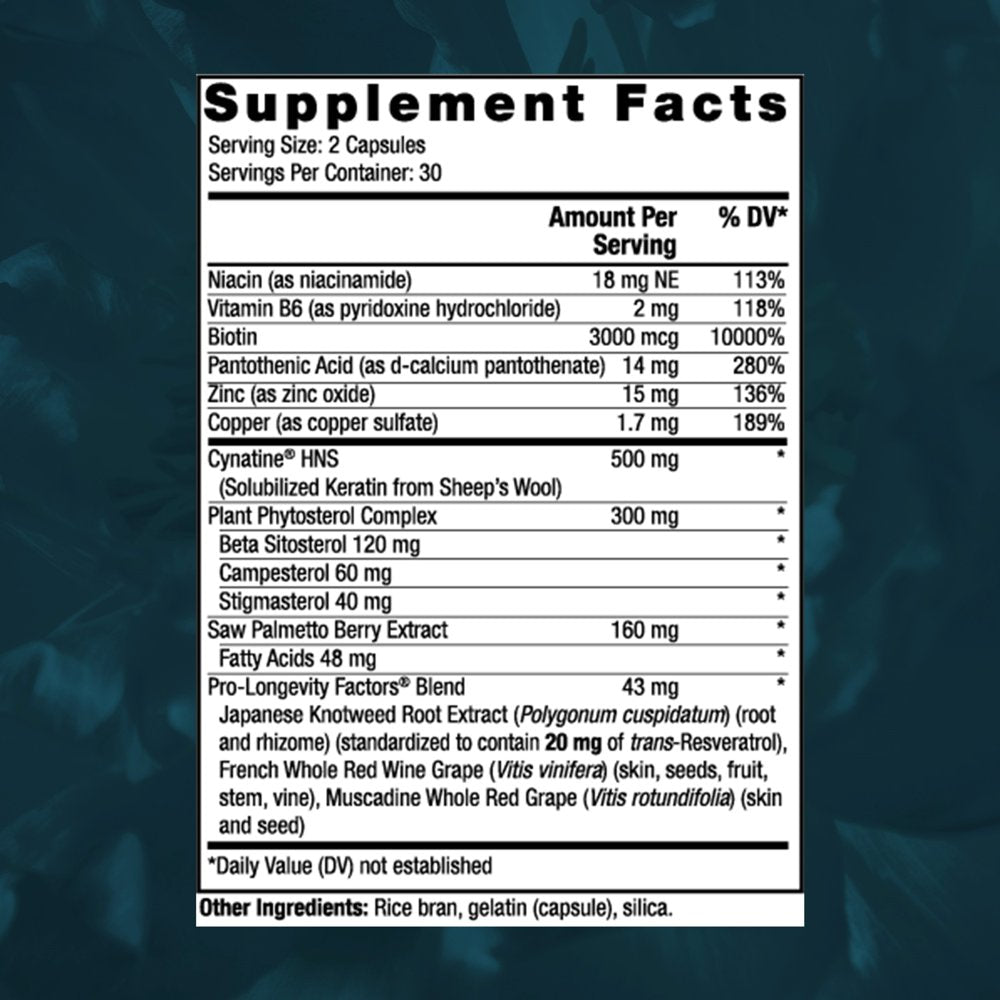 - Healthy hair starts here: Contains Cynatine HNS, a highly absorbable form of keratin along with plant-derived saw palmetto, beta sitosterol and our Pro-Longevity Factors Blend