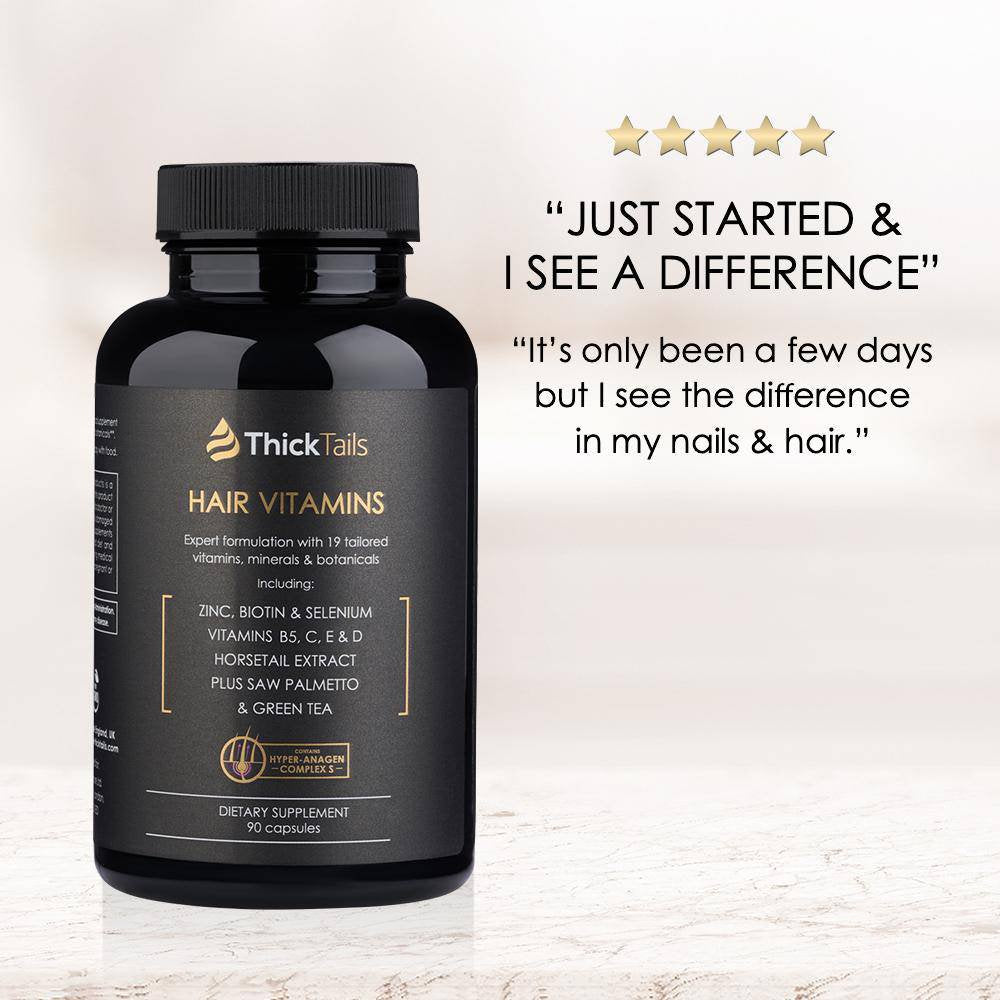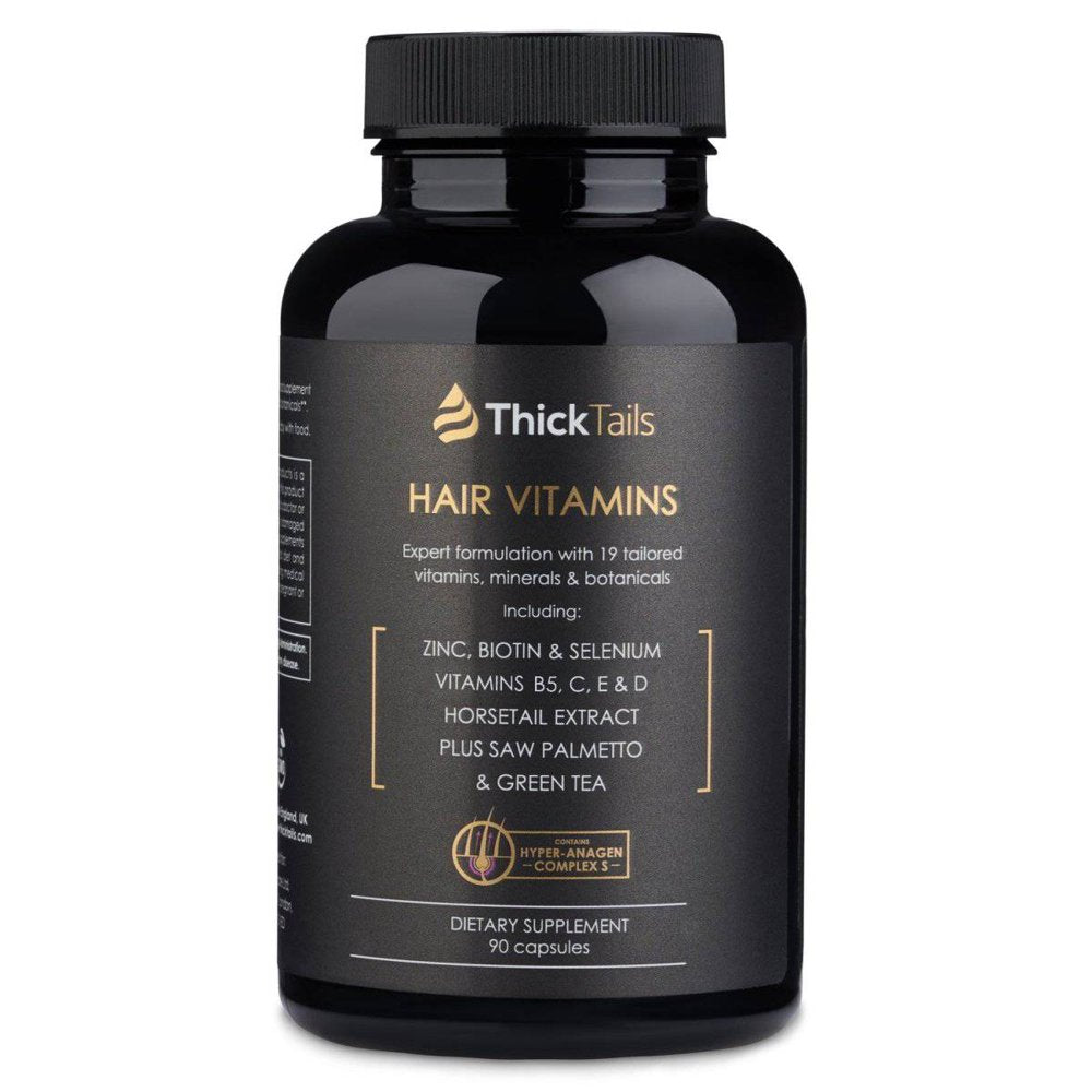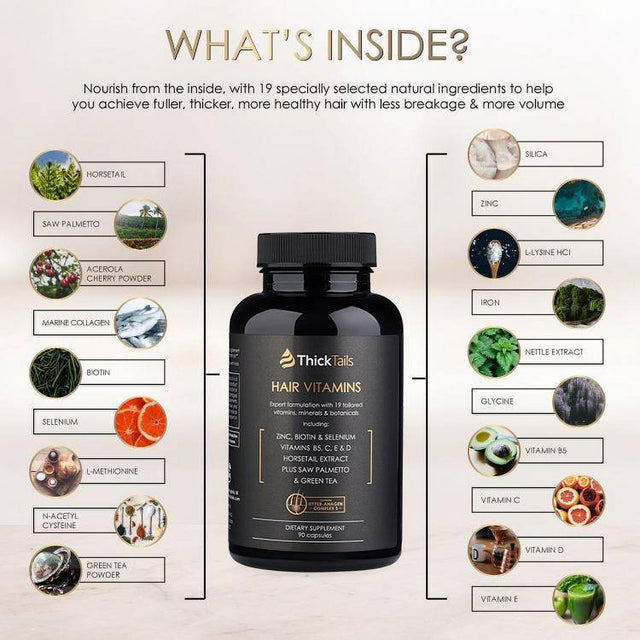 ThickTails Hair Growth & Strengthening Food Supplement has been designed to leave your hair looking naturally fuller, thicker, and healthier with less breakage and more volume. Our product has Includes Zinc, Biotin, Iron, Selenium, Vitamins B5, C, E & D, Horsetail, Saw Palmetto, Green Tea Extract, Nettle Leaf Extract, Acerola Cherry, and Marine Collagen.