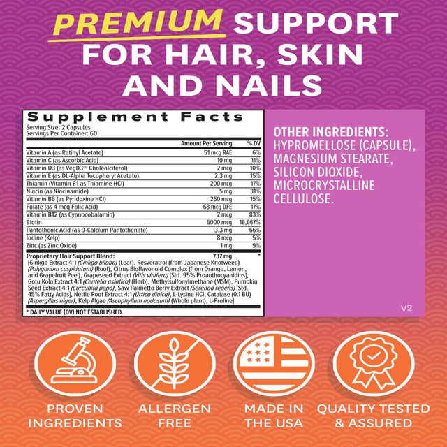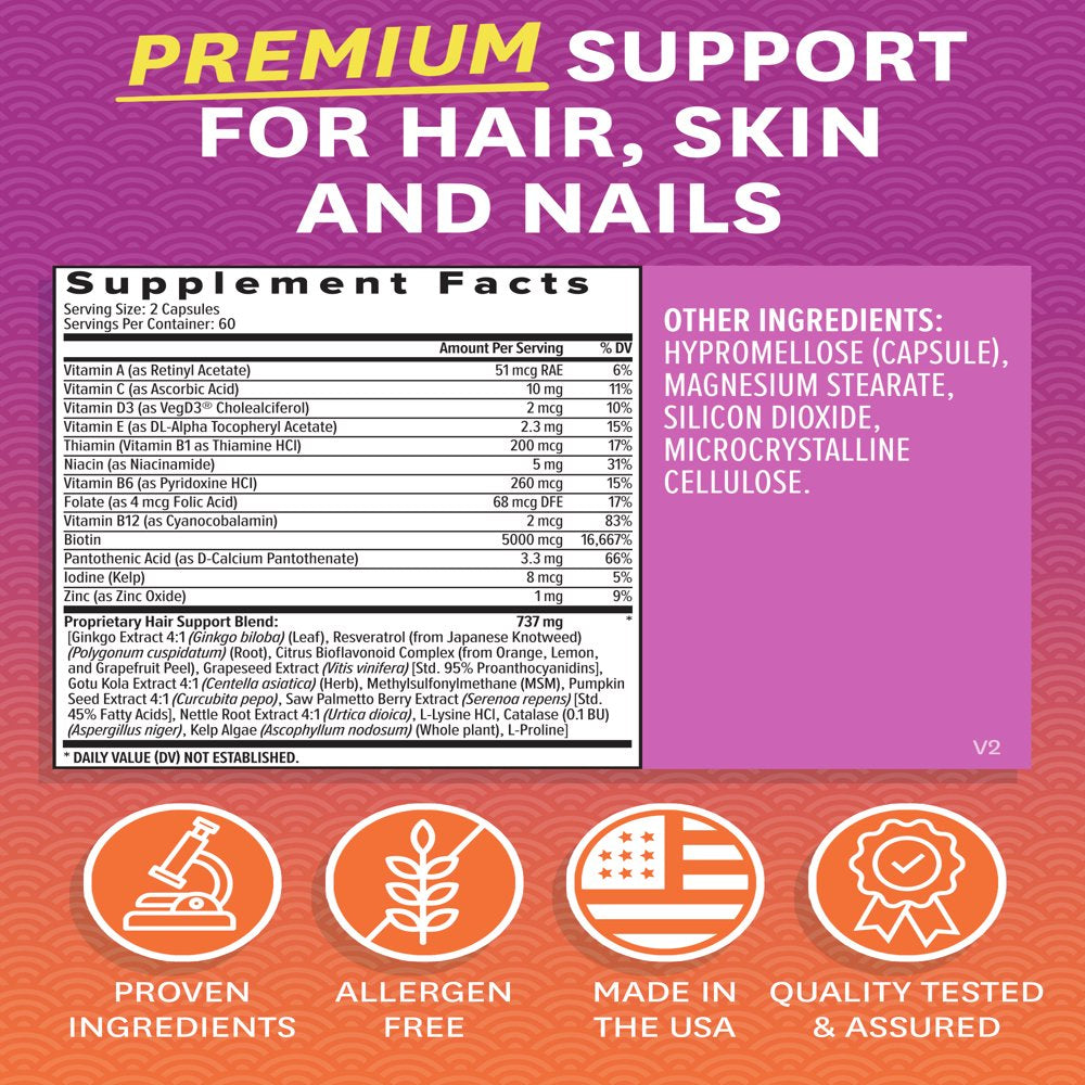 - Biotin for healthy hair growth: Includes a hefty 5000mcg of Biotin [Vitamin B7] to protect against thinning hair and restore thickness, strength, softness, and shine. Biotin also help improve the overall health of skin and nails.