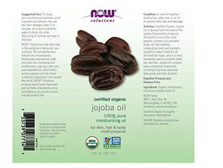 NOW Solutions, Organic Jojoba Oil, Moisturizing Multi-Purpose Oil for Face, Hair and Body, 8-Ounce