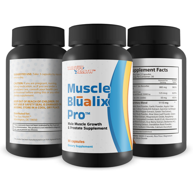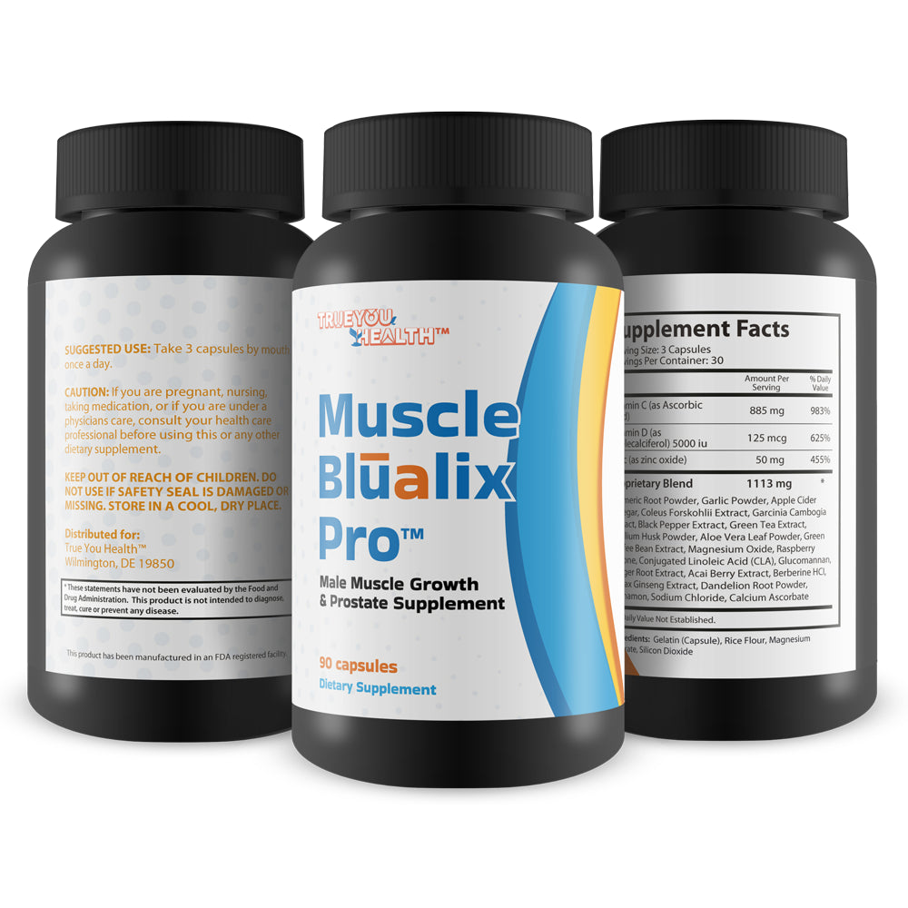 Muscle Blualix Pro is an all-in-one premium prostate supplement designed to support prostate health & overall wellness in men. The advanced prostate formula contains over 20 vitamins, minerals, antioxidants, and herbs for complete prostate support and additional health benefits. Turmeric and Vitamin C were added to support normal prostate size. It also contains Vitamin D to promote urinary health and improved bladder control. Other key ingredients in Pro Muscle Blualix Pills are Panax Ginseng, Green Tea Extract, Zinc, Magnesium, and Berberine. The combined ingredients in this high potency formula support healthy prostate function, kidney health, immune health, and more. This is our best prostate supplement we’ve ever created. For best results incorporate moderate exercise and a healthy diet while taking Pro Muscle Blualix Male Pill daily.