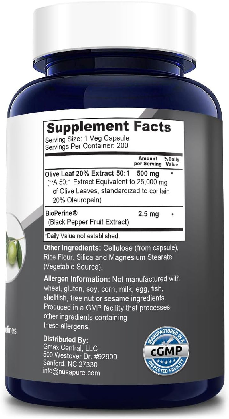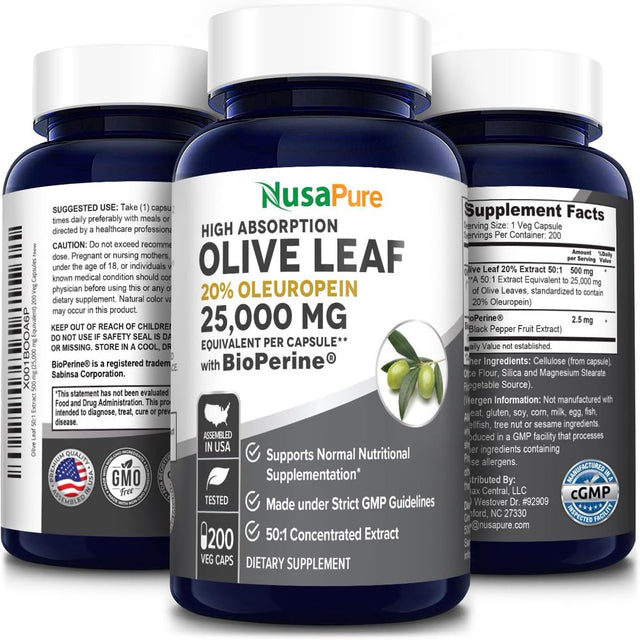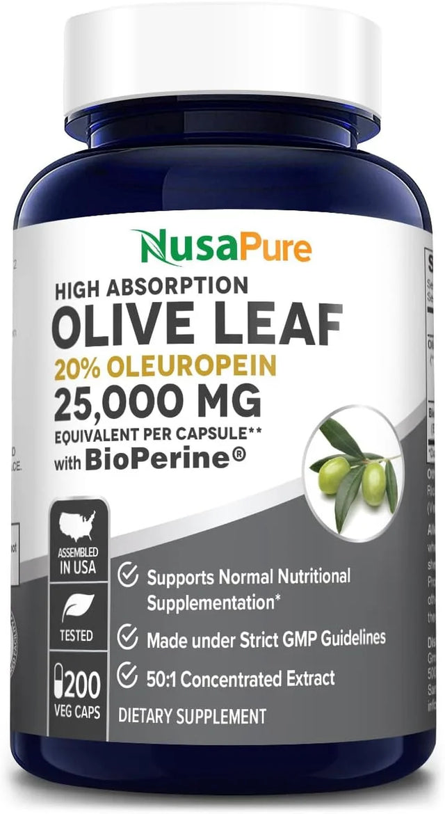 Nusapure 25,000Mg, 200 Caps Olive Leaf Extract: Non-Gmo, 20% Oleuropein, Vegetarian, Super Strength, Oil-Free, Dietary Supplement for Unisex Adult Health & Wellness