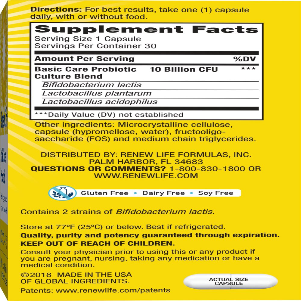 Renew Life Adult Probiotic - Basic Care Probiotic Supplement Health & Wellness - Shelf Stable, Gluten, Dairy & Soy Free - 10 Billion CFU - 30 Vegetarian Capsules