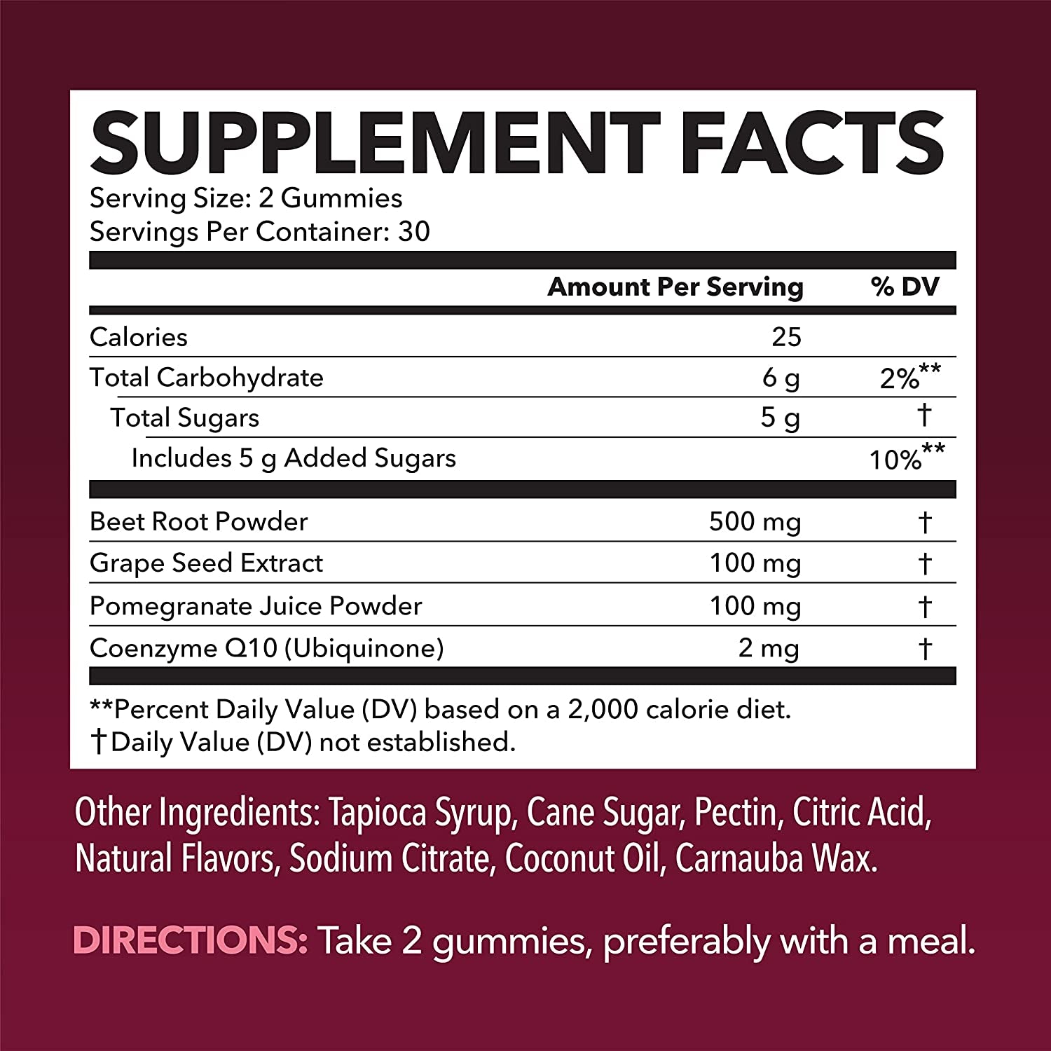 - Beet Root Powder combined with grape seed extract, pomegranate juice powder, and CoQ10 are combined for maximum benefits. As we age, our CoQ10 production naturally decreases. Support your vascular health and cells with these delicious energy gummies.