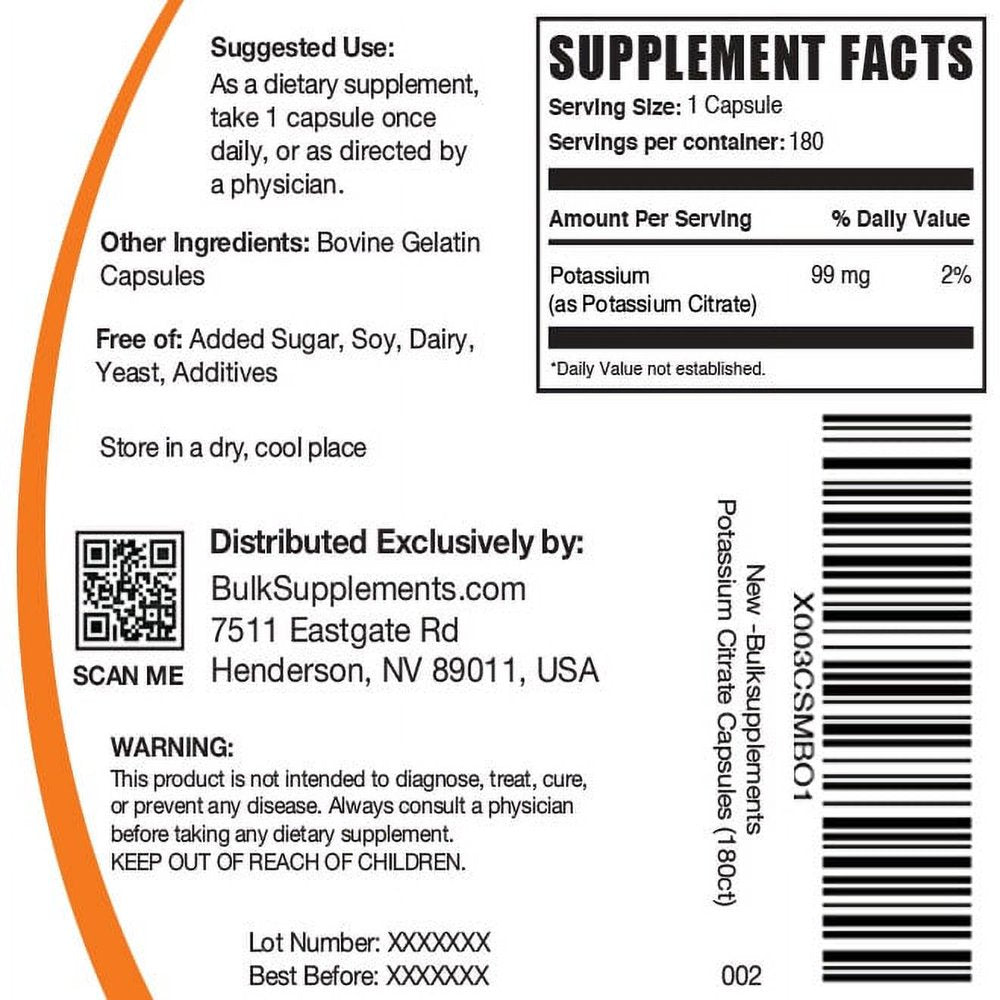 Bulksupplements.Com Potassium Citrate Capsules, 99Mg - Brain/Heart Health Supplements (180 Gel Capsules - 180 Servings) is backordered and will ship as soon as it is back in stock.