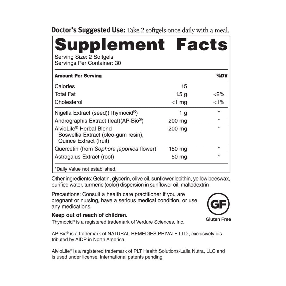 ULTIMATE Lung and Bronchial Support contains clinically validated key ingredients AlvioLife, AP-Bio, and black seed oil with traditionally used quercetin and astragalus to support clear breathing, optimal lung function, and immune health, while also supporting your heart! Additionally, Ultimate Lung & Bronchial supports endothelial and cardiovascular, which is important given the key role that your lungs play in your cardiovascular system. You won’t find the exclusive combination of AlvioLife, quercetin, and astragalus in any other formula! The star ingredient is AlvioLife, a blend of Boswellia and Quince fruit extracts, shown in a clinical study to be effective in helping maintain clear airways and cope with the respiratory effects of common environmental and seasonal challenges, in turn helping support clear breathing, normal lung function, a healthy inflammatory response and a healthy respiratory system. AP-Bio, a clinically validated extract of A. paniculate, delivers immune system support plus support for mucus consistency during seasonally challenging times, as well as help for occasional head, throat, and ear discomfort, tiredness, nasal secretions, and sleep disturbances due to seasonal challenges. Thymocid organic black seed oil delivers benefits for those suffering from respiratory seasonal challenges, providing relief from nasal congestion, secretions and irritations, eye-related difficulties, and common ear, nose, and throat symptoms. Black seed oil helps support lungs and easier breathing, a healthy immune response, and support against oxidative stress. Finally, astragalus helps support your lungs and quercetin supports endothelial function, which impacts blood flow, and supports a healthy cardiovascular system.