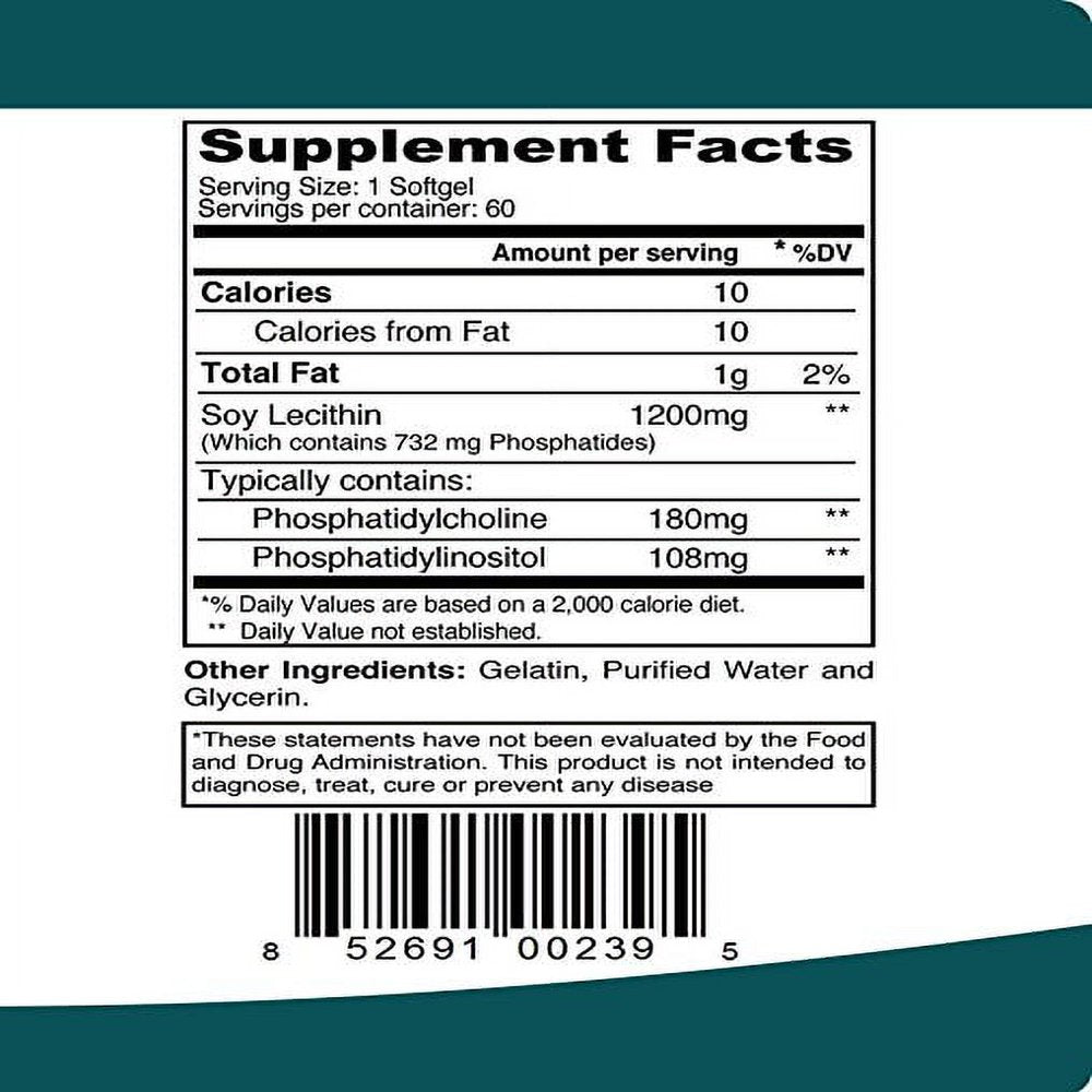 Natural Source of Choline. Promotes Nerve & Heart Health. 1200mg 60 count Softgels. Main Ingredient: Soy Lecithin Other Ingredients: Gelatin, Purified Water, and Glycerin
