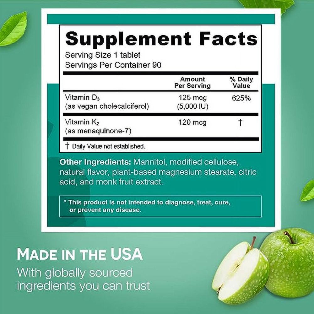 EZ Melts Vitamin D3 K2 Promotes Optimal Bone and Heart Health, 5000 IU 90 Tablets, Apple Flavored, Vegan Dietary Supplements, Dissolvable and Fast Melting
