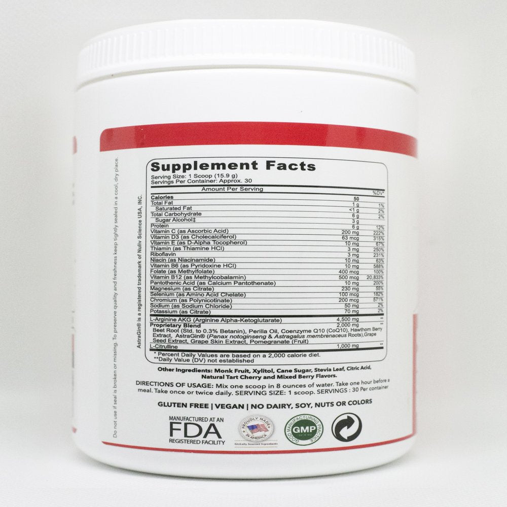 - PACKED WITH VITAL NUTRIENTS: Our Heart Health Powder is formulated and contains powerful essential vitamins and nutrients. L-Arginine helps the body to build protein. It changes into Nitric Oxide in the body and helps to dilate the walls of the blood vessels. L-Citrulline enhances Nitric Oxide production in the body. Coenzyme Q10 (CoQ10) aids in restoring optimal energy levels and stamina.
