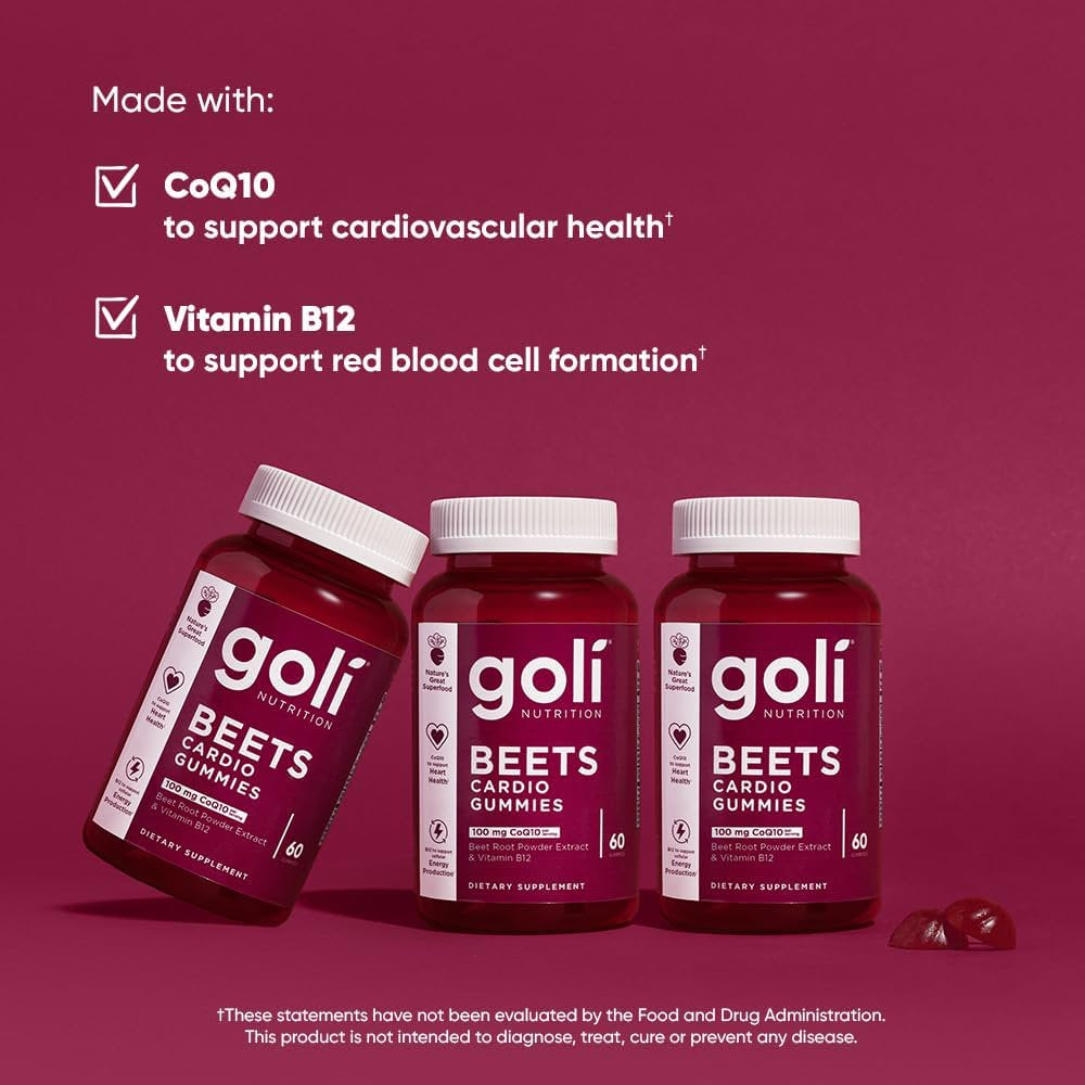 - We’ve got your wellness at heart: Goli® Beets Cardio Gummies are made with CoQ10 to support cardiovascular health.**These statements have not been evaluated by the Food and Drug Administration. This product is not intended to diagnose, treat, cure or prevent any disease.