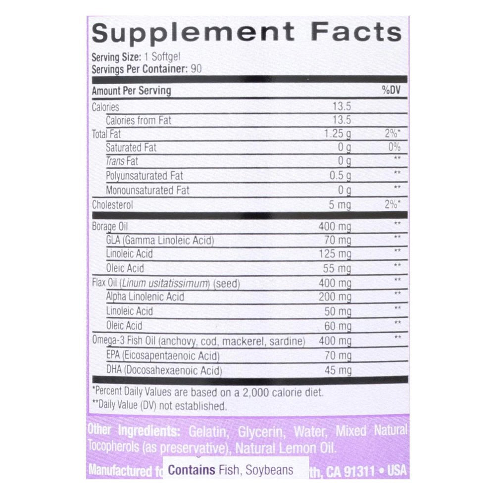 Natrol omega 3-6-9 dietary supplement is a mixture of fish, borage and flax oils that combine to give you a healthy dose of essential fatty acids to help support cognitive and cardiovascular health. The mix of both grain and oil sources also helps support healthy hair and skin. The ingredients also include lemon oil for a refreshing taste. This 90 count bottle contains 90 single softgel servings that should be taken twice a day.