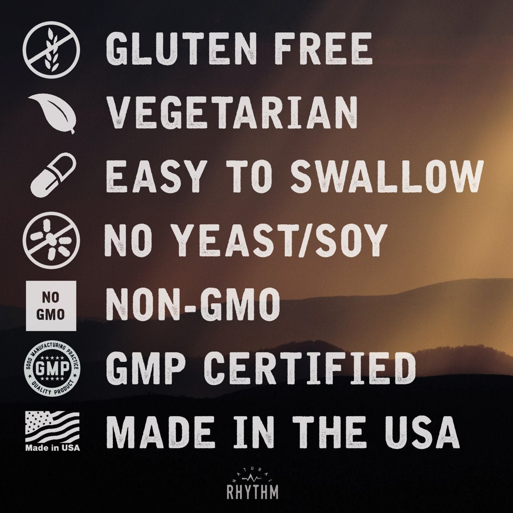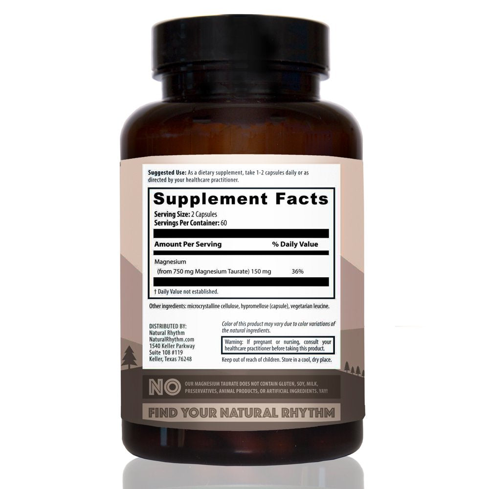Did you know that low levels of magnesium can cause you to feel tired, weak, irritable, anxious, stressed? Do know low levels of magnesium can also cause heart palpitations, leg cramps, muscle twitches, and restless legs? That’s why we created Magnesium Taurate. Magnesium Taurate is beneficial for your cardiovascular and nervous system and is designed for optimal absorption and effectiveness! Our Magnesium Taurate is different than the others. We pack 75mg of premium elemental magnesium taurate into a single size 0 capsule that is easy to swallow. Our capsules are also vegetarian, non-gmo, and gluten free. Each batch is tested for heavy metals to ensure that you get the very best magnesium tuarate possible. At Natural Rhythm, we are dedicated to providing you the best resources and products to help you fight stress and anxiety, find a sense of calmness and peacefulness, and return to your life's natural, healthy rhythm. If you have any questions or concerns, or our unsatisfied for any reason, please let us know!