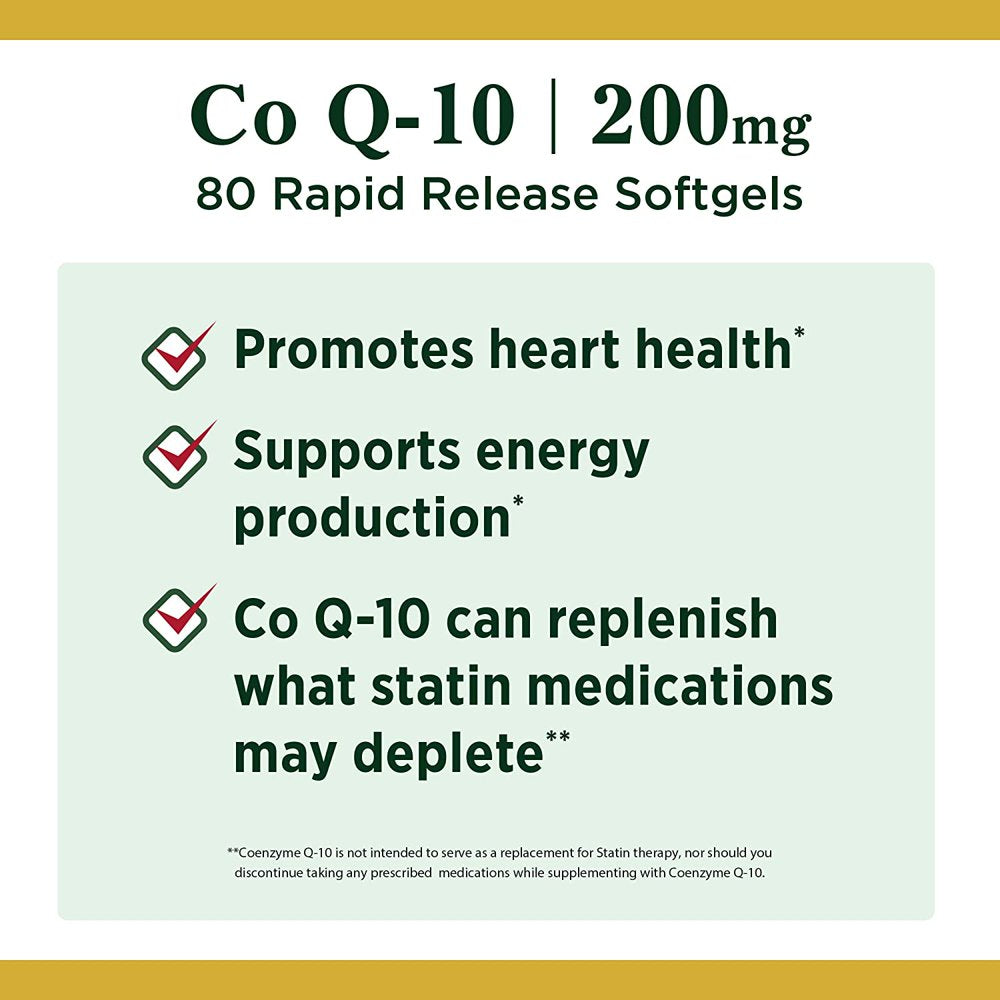 - FOR YOUR HEART 80-count, 200mg CoQ-10 Rapid Release Softgels. Coenzyme Q-10 is one of the leading supplements recommended to help promote cardiovascular health.(1) Nature’s Bounty CoQ-10 can even replenish what statin medications may deplete.(2)