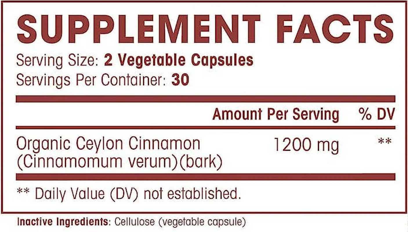 Genuine "true cinnamon" sourced direct from Ceylon and made in the USA, Made with Organic Cinnamon, Veggie capsules Cinnamon superfood is potent antioxidant with health and wellness benefits, including support for glucose metabolism and optimal joint health 100% purchase price guarantee - if you are not satisfied with results, we will refund your purchase price 60 capsules per bottle, manufactured to highest standards in a GMP-certified facility; no artificial ingredients, certified Happy-Healthy-Humane Manufacture