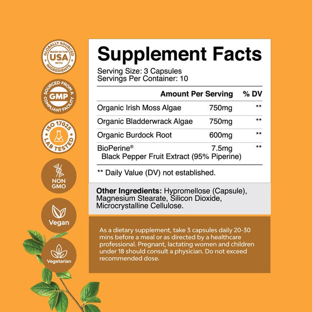 Organic Irish Sea Moss Capsules - Sea Moss and Bladderwrack Capsules with Burdock Root Superfood Blend for Immune Support Heart Health Fertility Joint Health and Thyroid Support for Women and Men