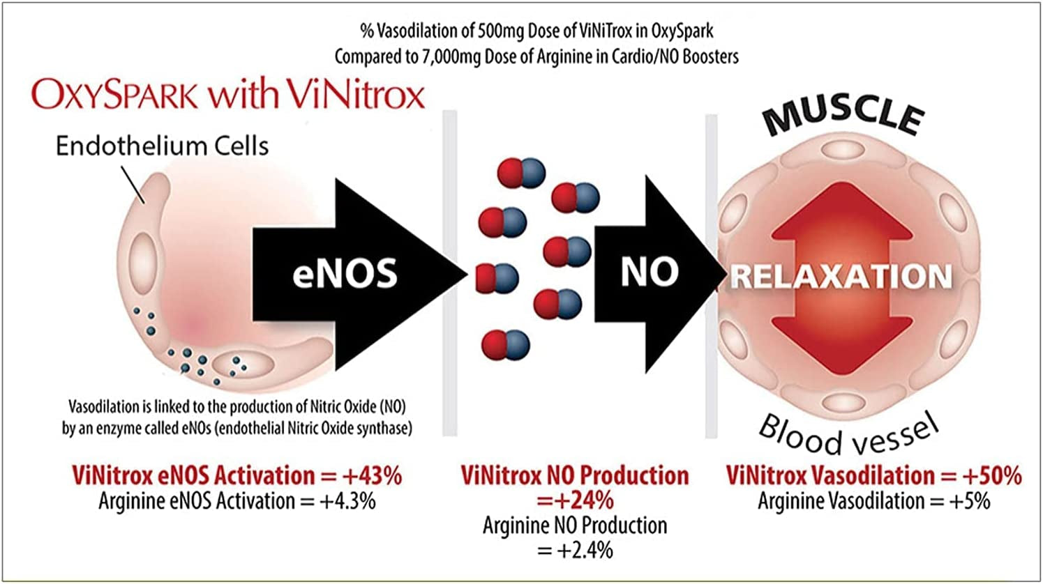 OxySpark is an all-natural nitric oxide booster that uses ViNitrox to stimulate nitric oxide production. In clinical studies, ViNitrox has been shown to dilate the cardiovascular system by 50% at only a 500mg dosage while other Arginine supplements only have a 5% effect. That's 10 times more effective per recommended dose in achieving and maintaining vasodilation than arginine-based supplements!