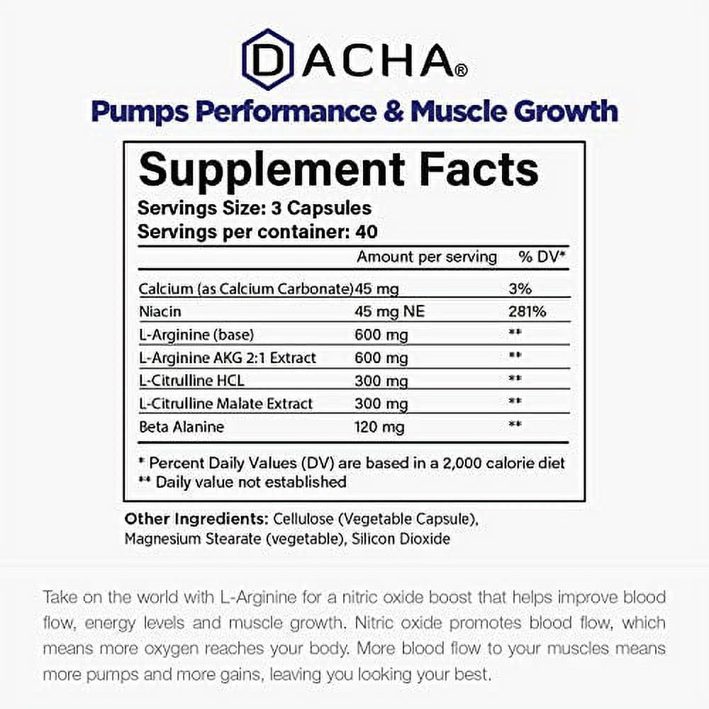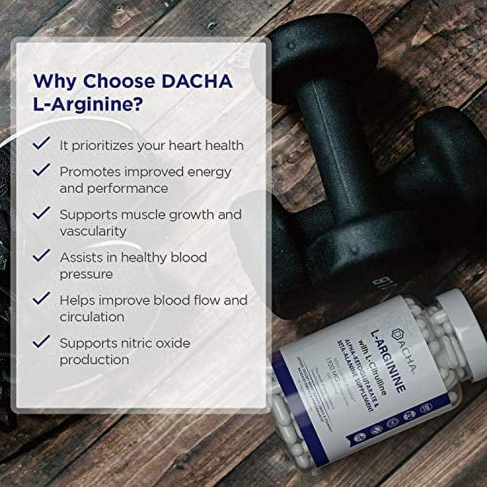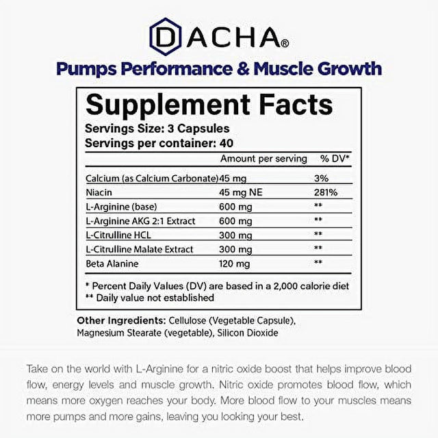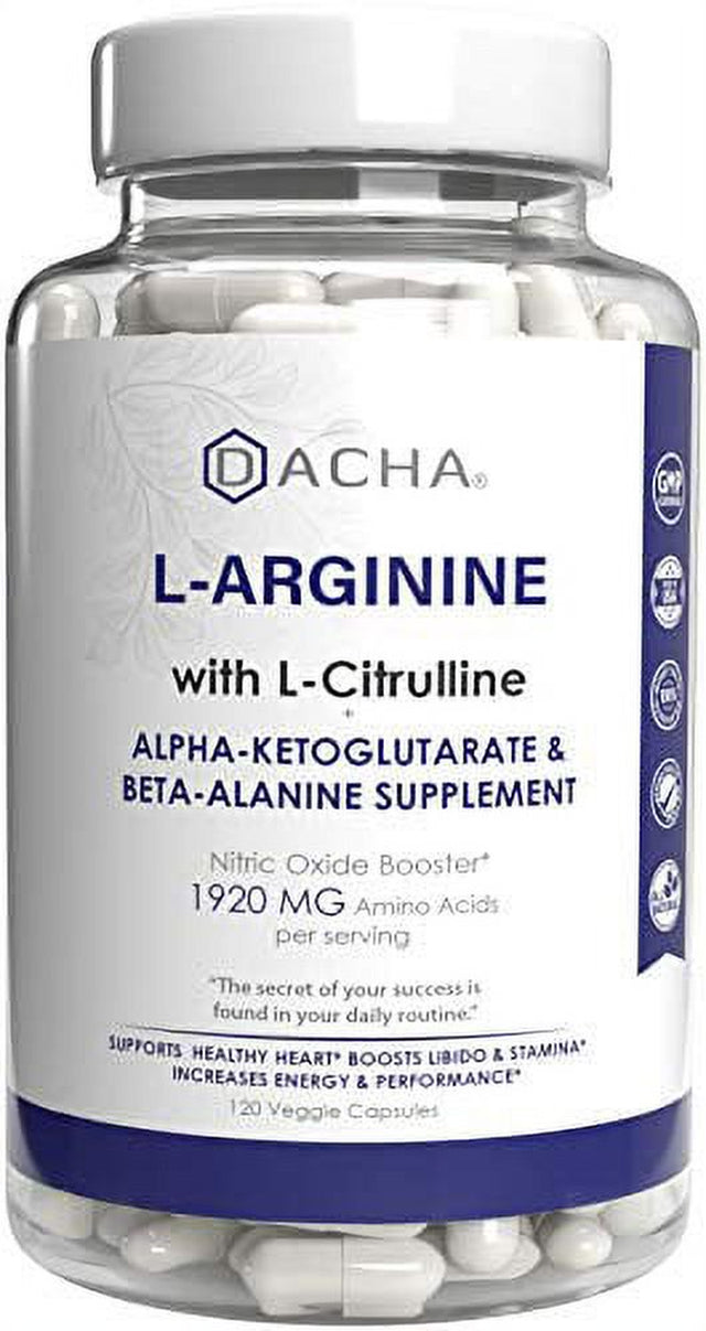 - High potency & extra strength - Dacha l-arginine has a high potency of 1920 mg per serving. Each serving contains 7-in-1 combined technology of l-arginine and l-citrulline, plus l-arginine alpha-ketoglutarate, l-citrulline malate, beta-alanine, niacin, and calcium. All these blended in one powerful supplement to help give you the results you need!