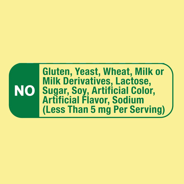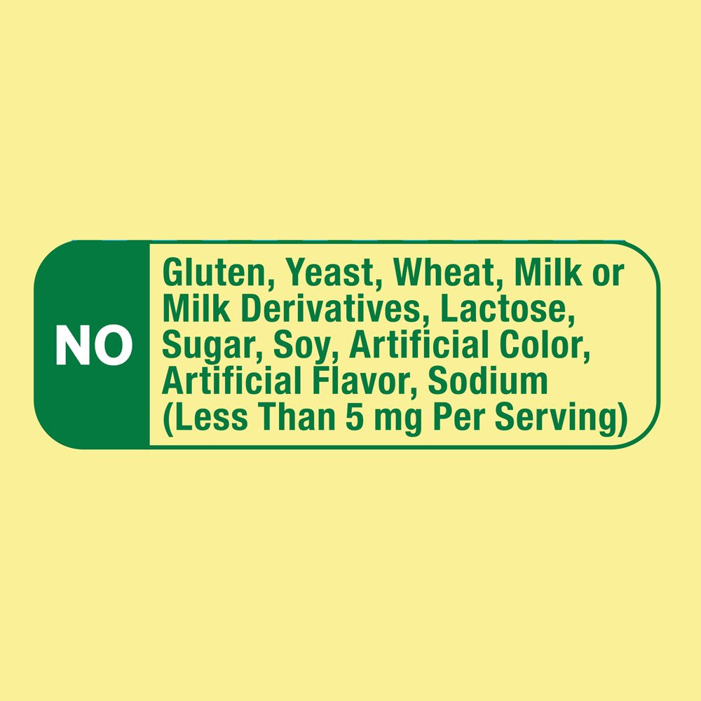 - No gluten, yeast, wheat, milk, milk derivatives, lactose, sugar, or soy