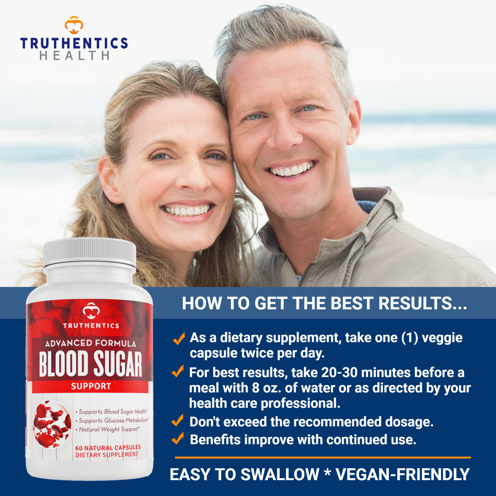 Maintaining healthy blood sugar levels is a crucial step in enhancing your overall health and wellbeing. Truthentics Blood Sugar Support Formula (60 capsules per bottle) is made with a blend of just the right amount of 20 essential Herbs, Vitamins, Minerals & Antioxidant including Cinnamon, Chromium, Magnesium, Alpha Lipoic Acid, and more to help maintain balanced sugar levels that are already within the normal range, and support glucose and carbohydrate metabolism so you feel your best throughout your day. * Maintaining healthy blood sugar levels helps improve your energy level, supports brain and heart wellness, aids with weight management, and can help reduce the risk of developing chronic conditions.* Buy With Confidence: When you buy Truthentics supplements you can be assured that you're getting exactly what's on the label in its purest form. Our Blood Sugar Support is manufactured at an NSF GMP Certified, FDA Registered Facility following Good Manufacturing Practices (GMP). Add to your cart today and try our products to help see and feel an amazing difference in your health.