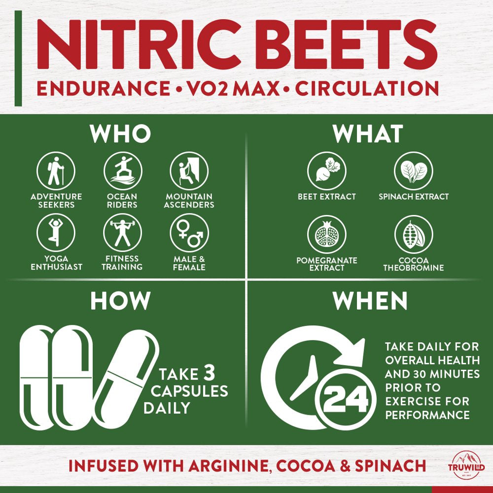 TRUWILD Nitric Oxide Beet Root Supplement is your partner in achieving your fitness goals, regardless of your current activity stage. Whether you're training for a marathon, hitting the gym, or simply staying active, our product is designed to elevate your performance, support muscle & heart health, and enhance your cardiovascular health in your pre-workout routine.