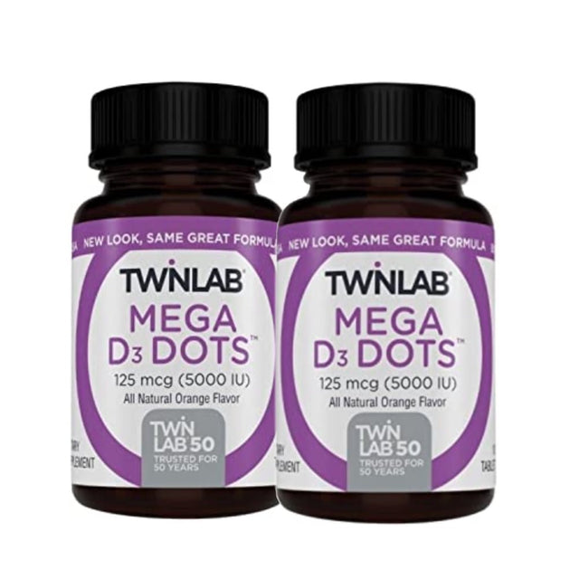Twinlab Mega D3 Dots - Vitamin D Tablets for Bone Strength, Heart Health, Joint Health, Immune Support - Pure Vitamin D3 5000 IU Sublingual, Orange Flavor, 100 Quick-Dissolve Tablets (Pack of 2)