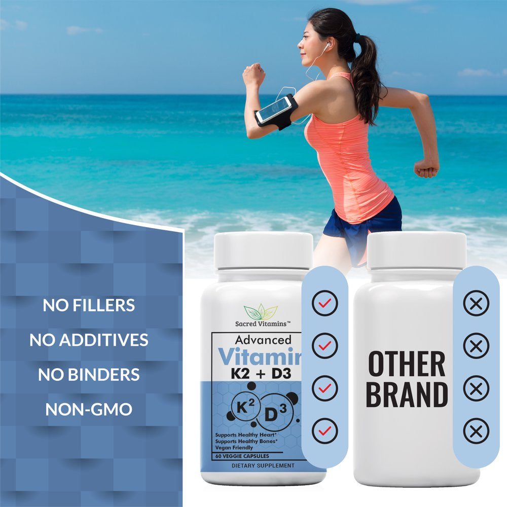 - VITAMIN K2 PLUS D3 AND MORE: As we age, our bone health and heart health is of the utmost importance! Don't suffer from potential health issues, be proactive, and tackle the issue from the source with our easy to take, daily K2 plus D3 vitamins! With our premium, additive-free complex you will love the way you feel! Just take one capsule per day!