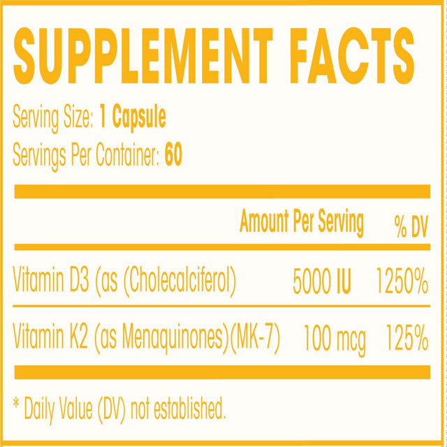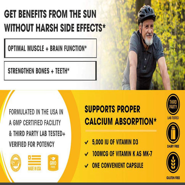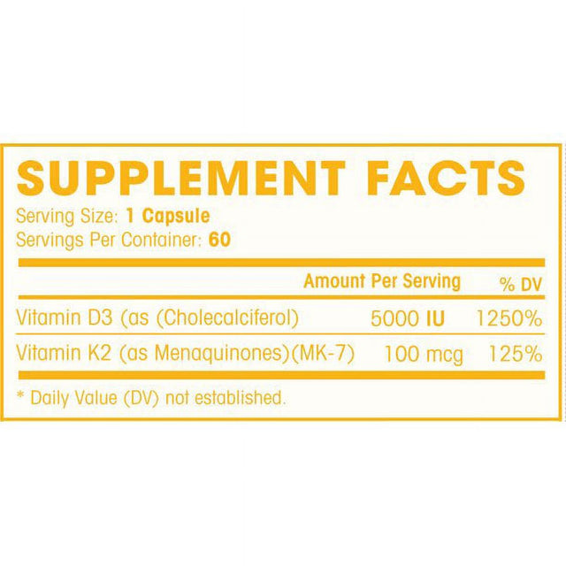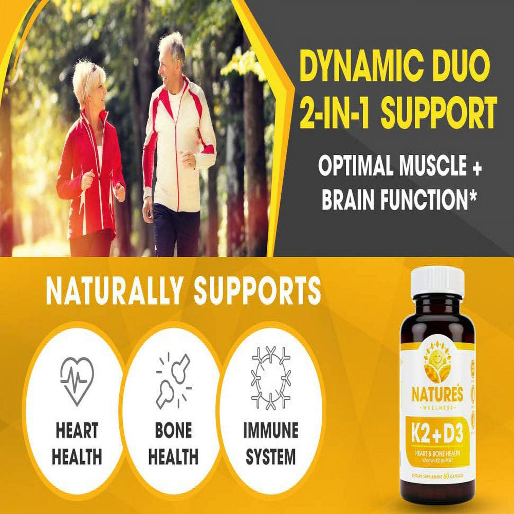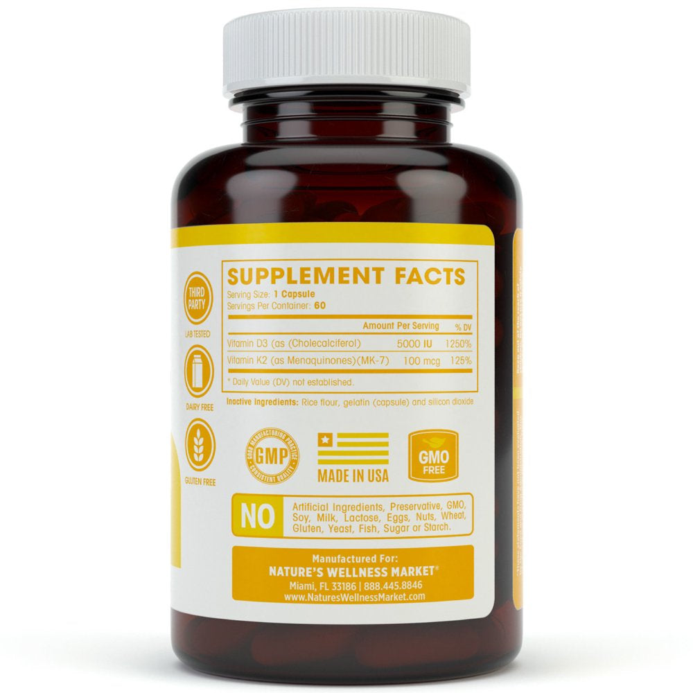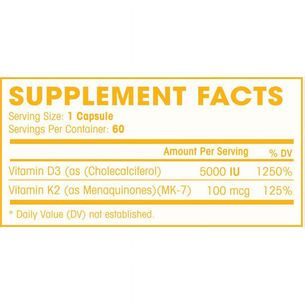 Vitamin K2 (mk7) with D3 Supplement for Best Absorption - 2-in-1 Support for Heart Health and Strong Bones | Vitamin D & K Complex | D3 5000 IU + K2 100 mcg | GMO & Gluten Free - 60 Count